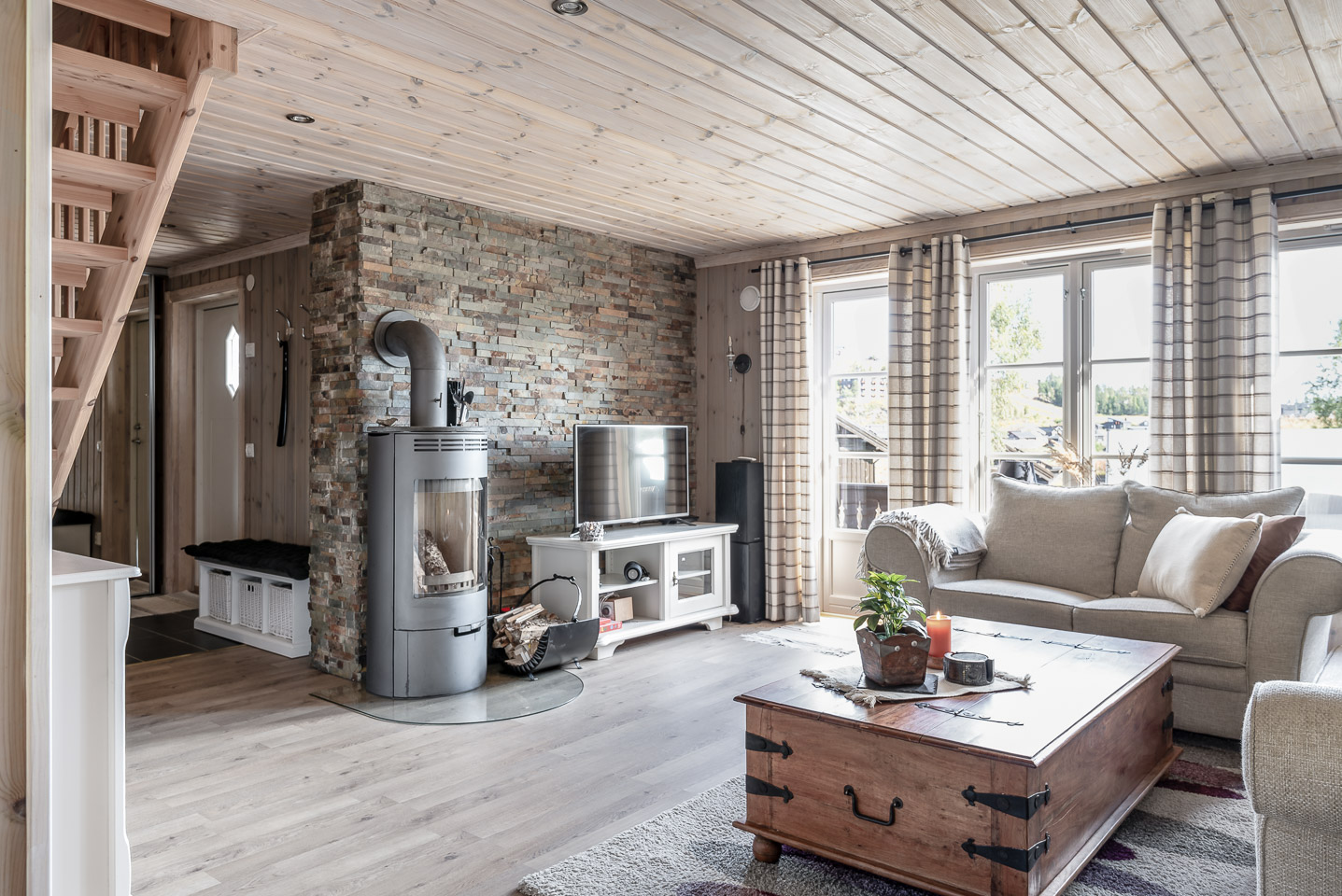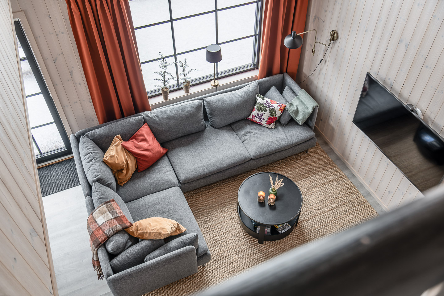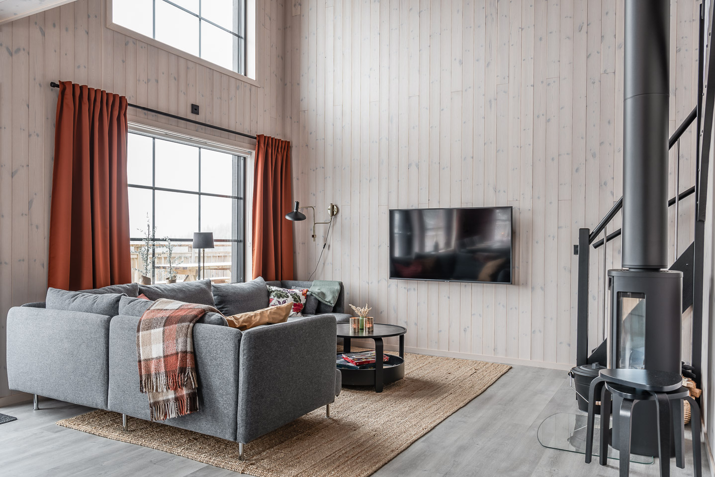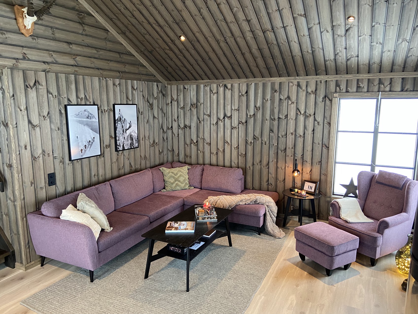 Stor hörnsoffa med tillhörande fåtölj, braskamin och tv.