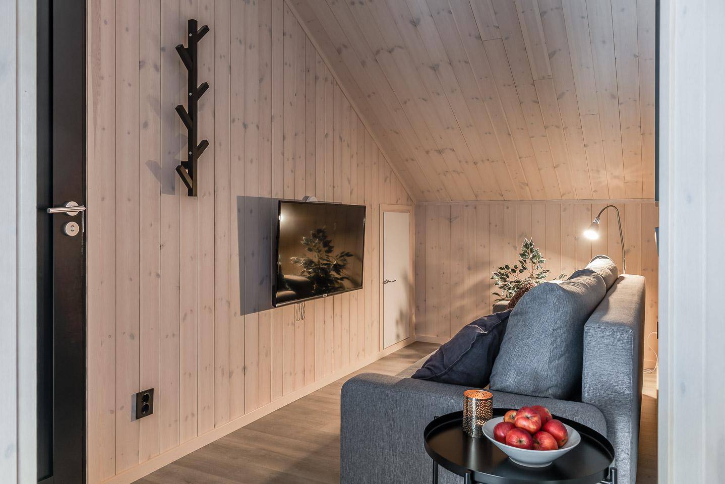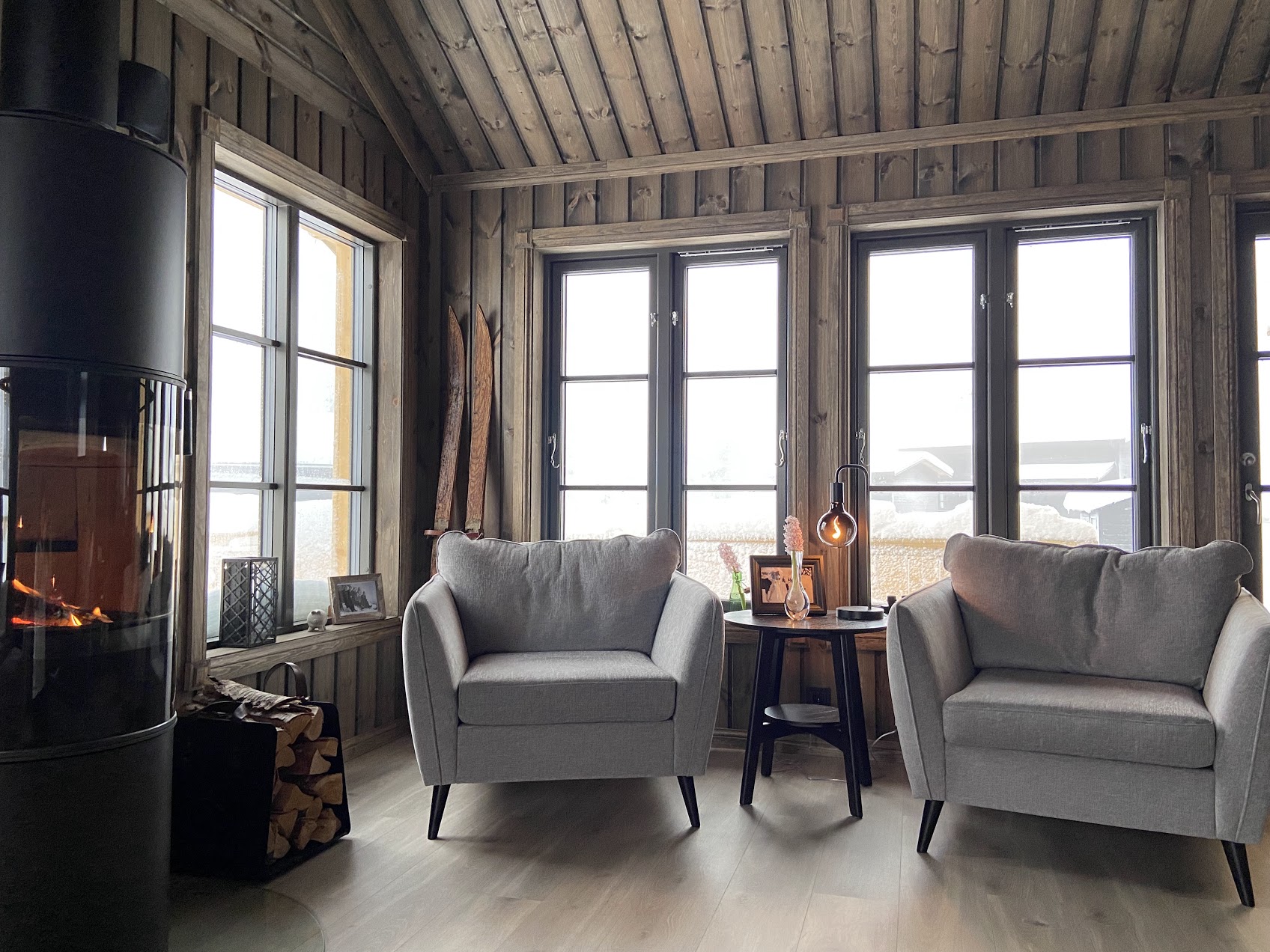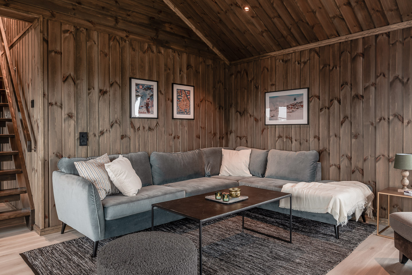 Stor hörnsoffa med tillhörande fåtölj, braskamin och tv.
