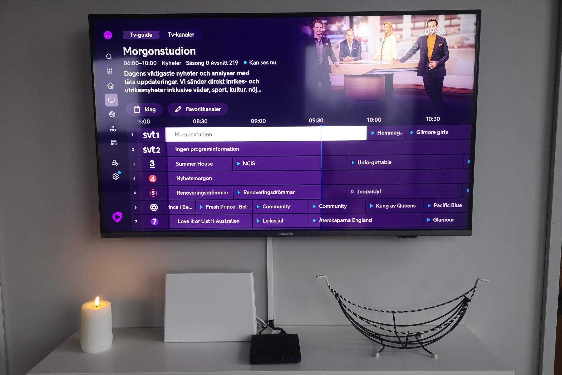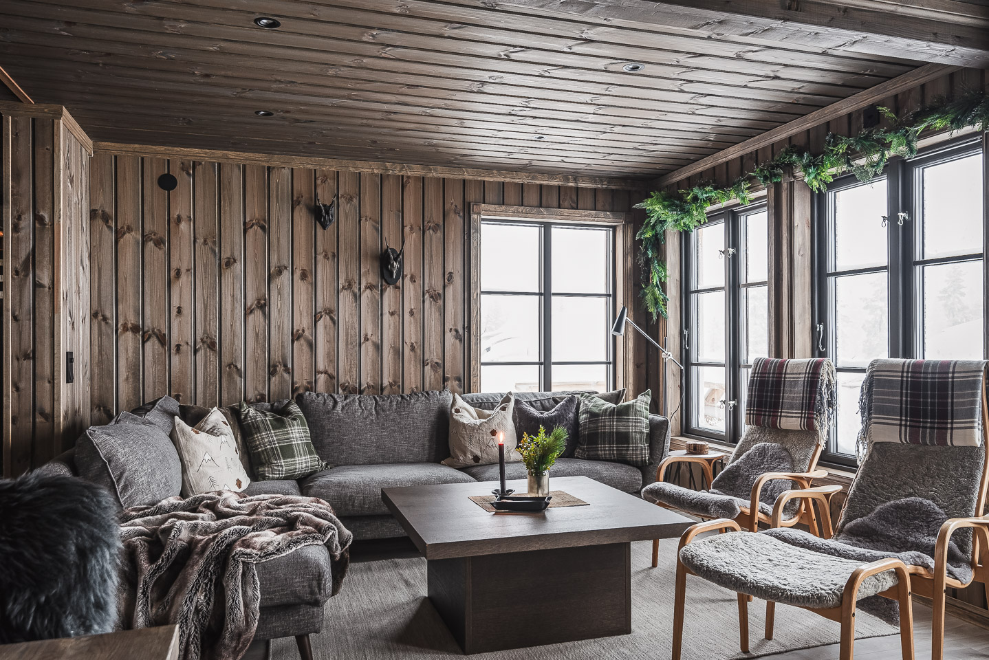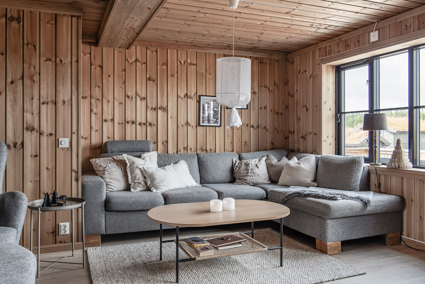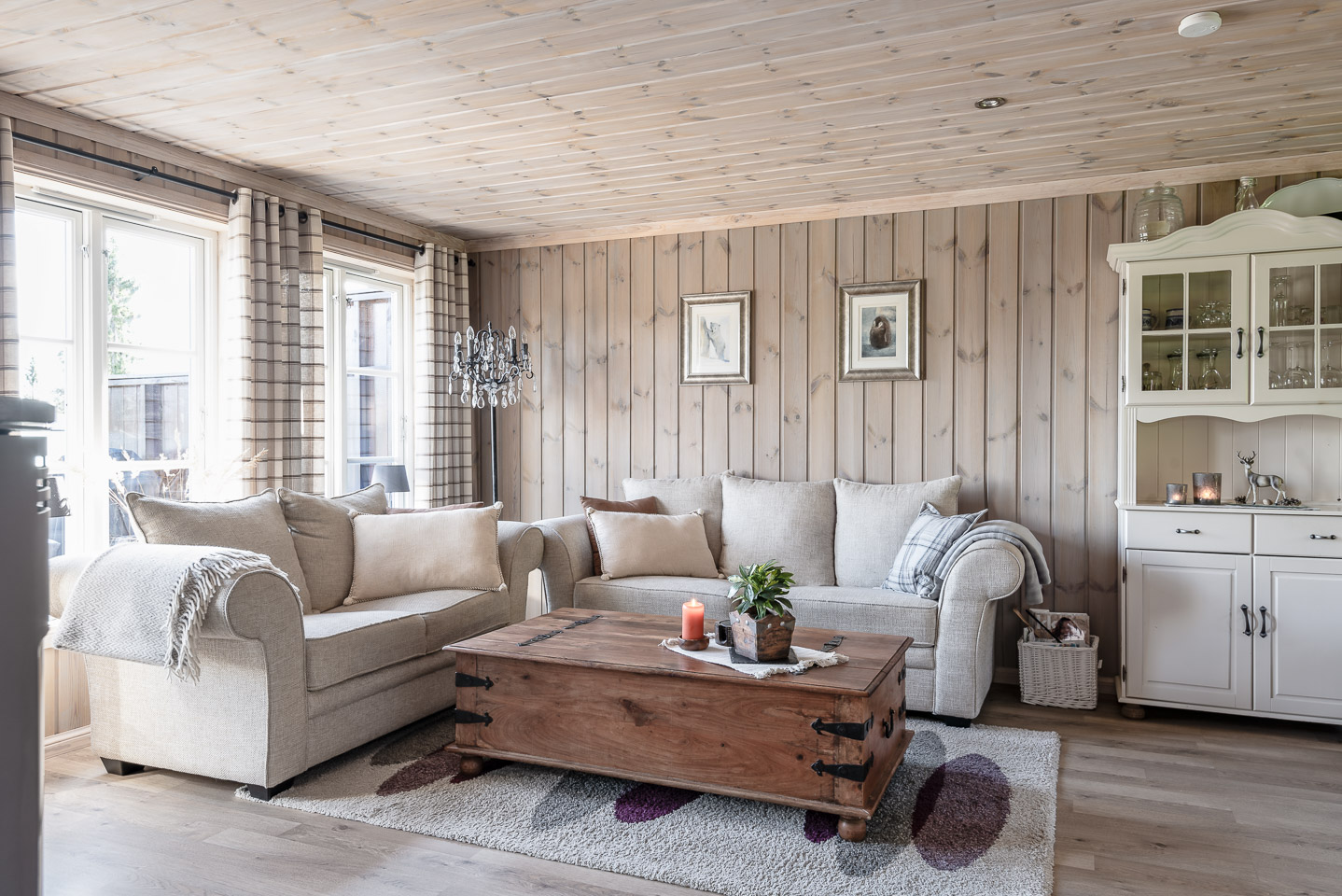 Stor hörnsoffa med tillhörande fåtölj, braskamin och tv.