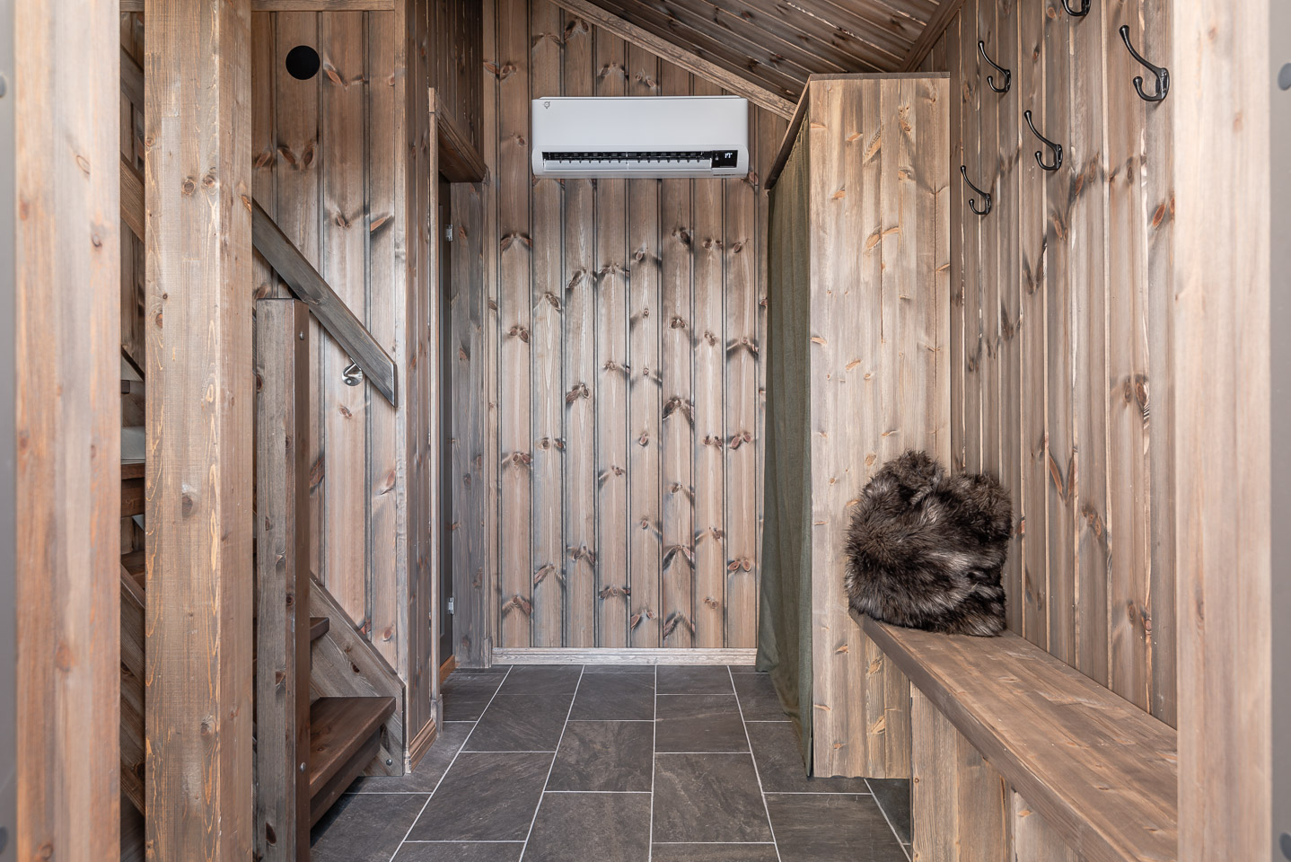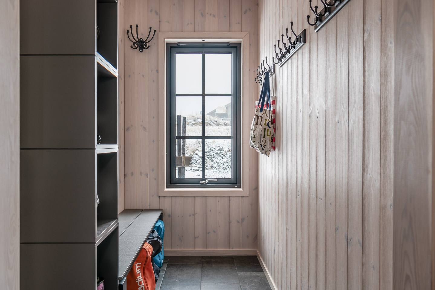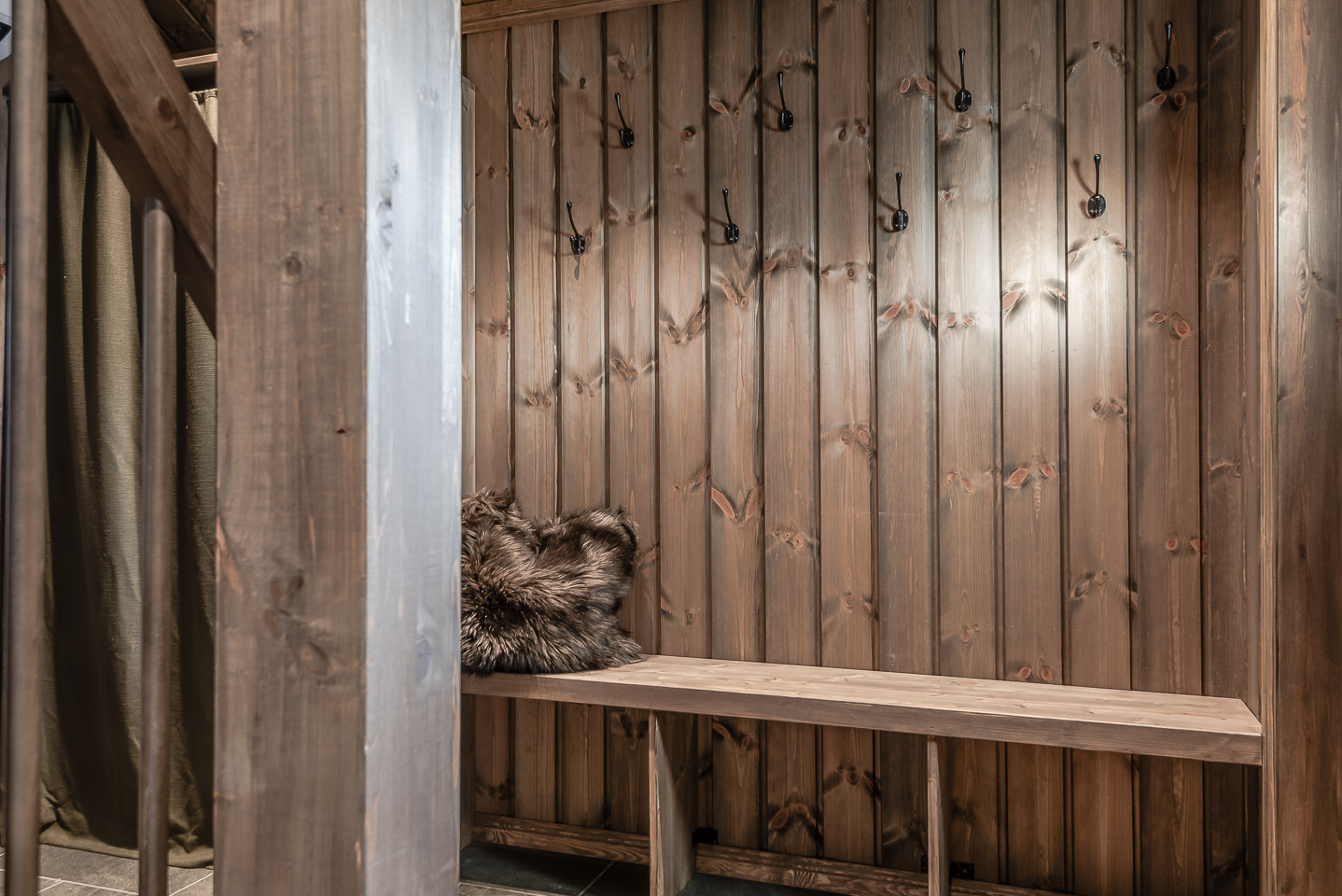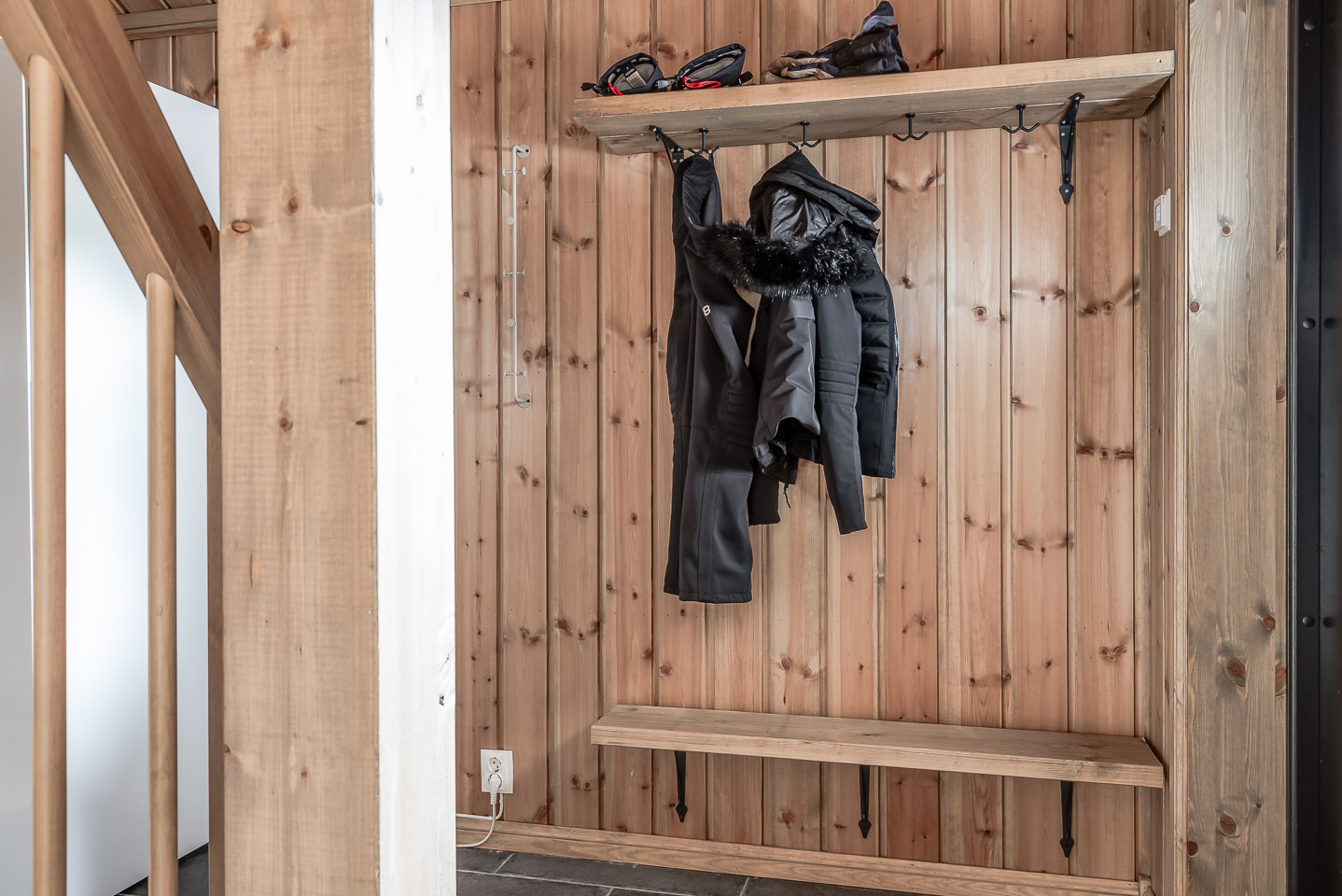 Byrå, krokar samt hyllor för att förvara skidutrustning.