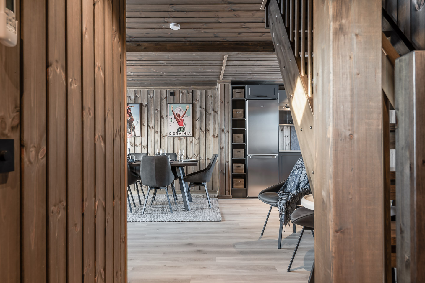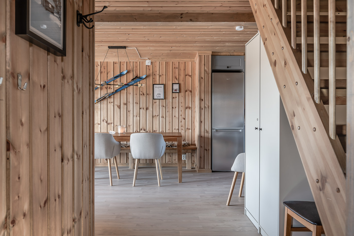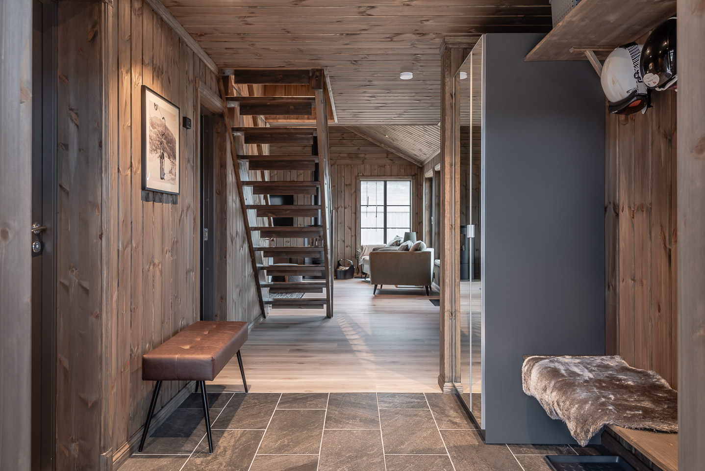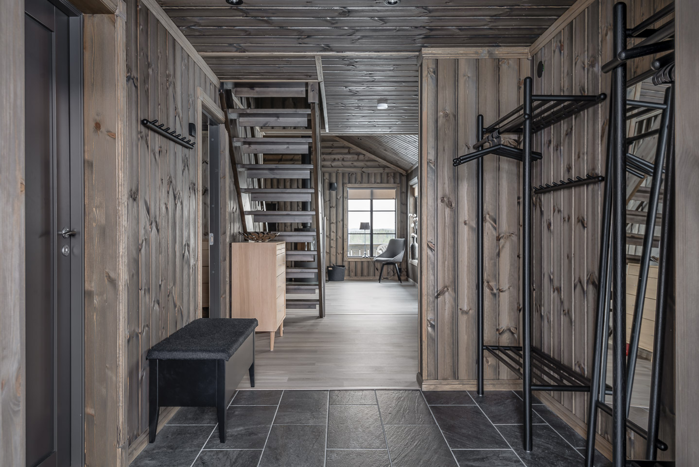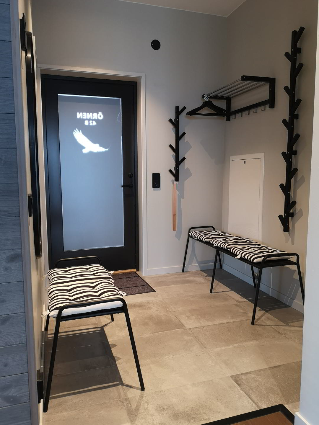 Byrå, krokar samt hyllor för att förvara skidutrustning.