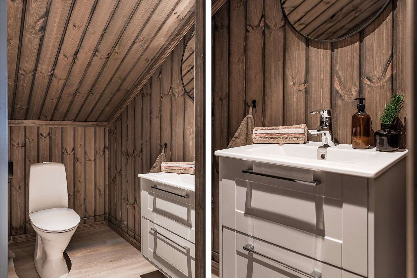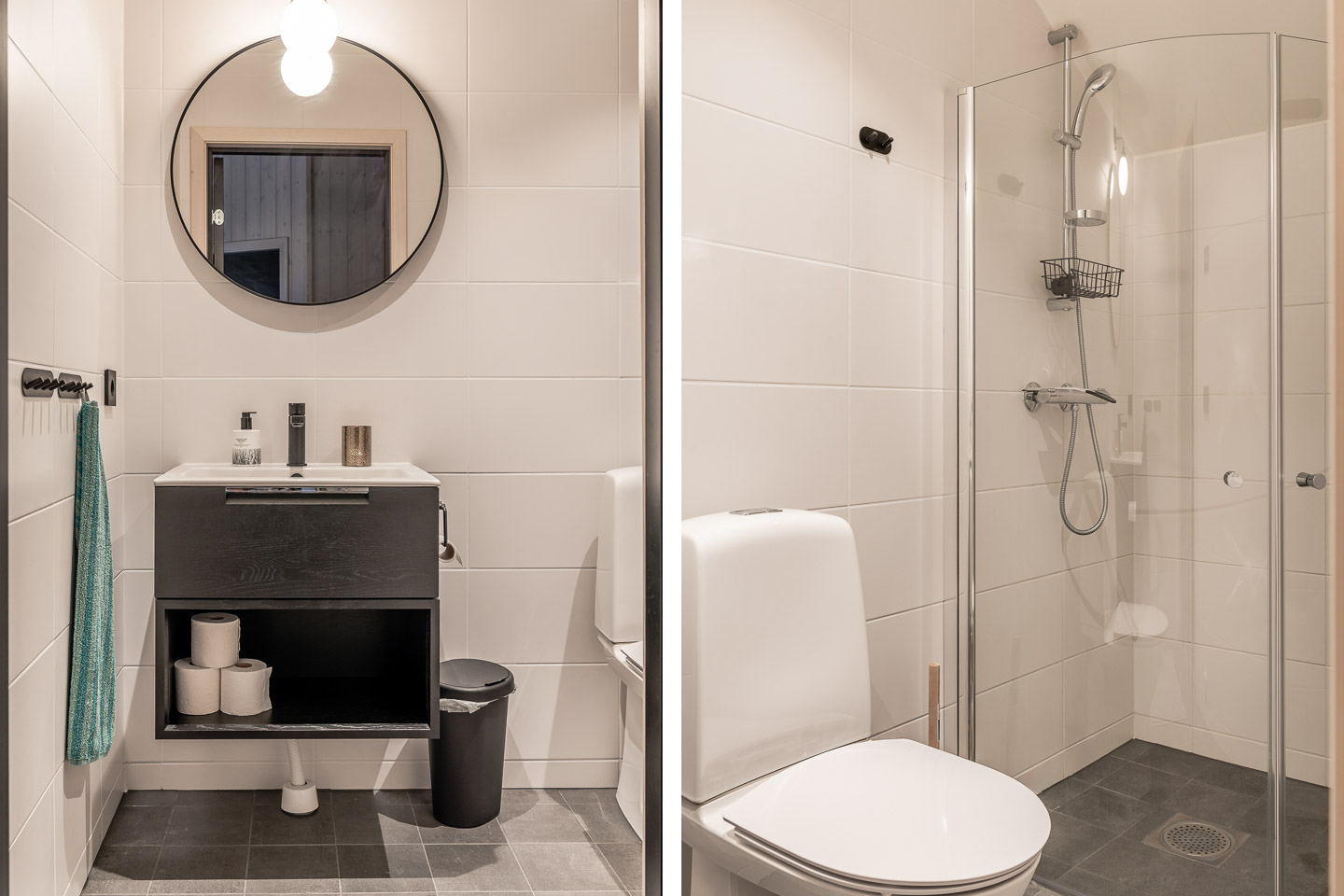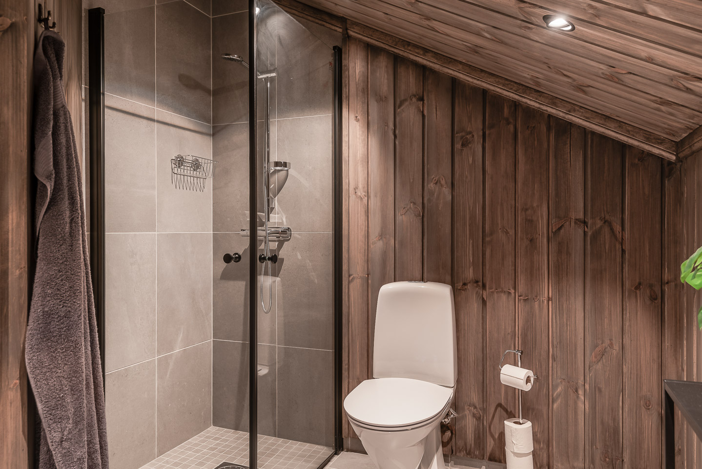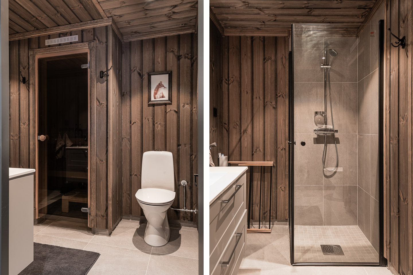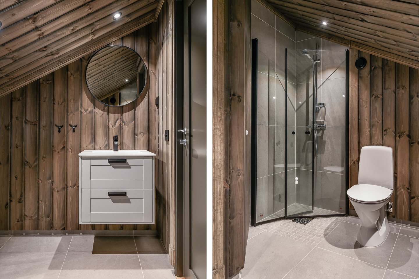 Det finns totalt två badrum i stugan ett på nedervåningen med dusch samt ett på
