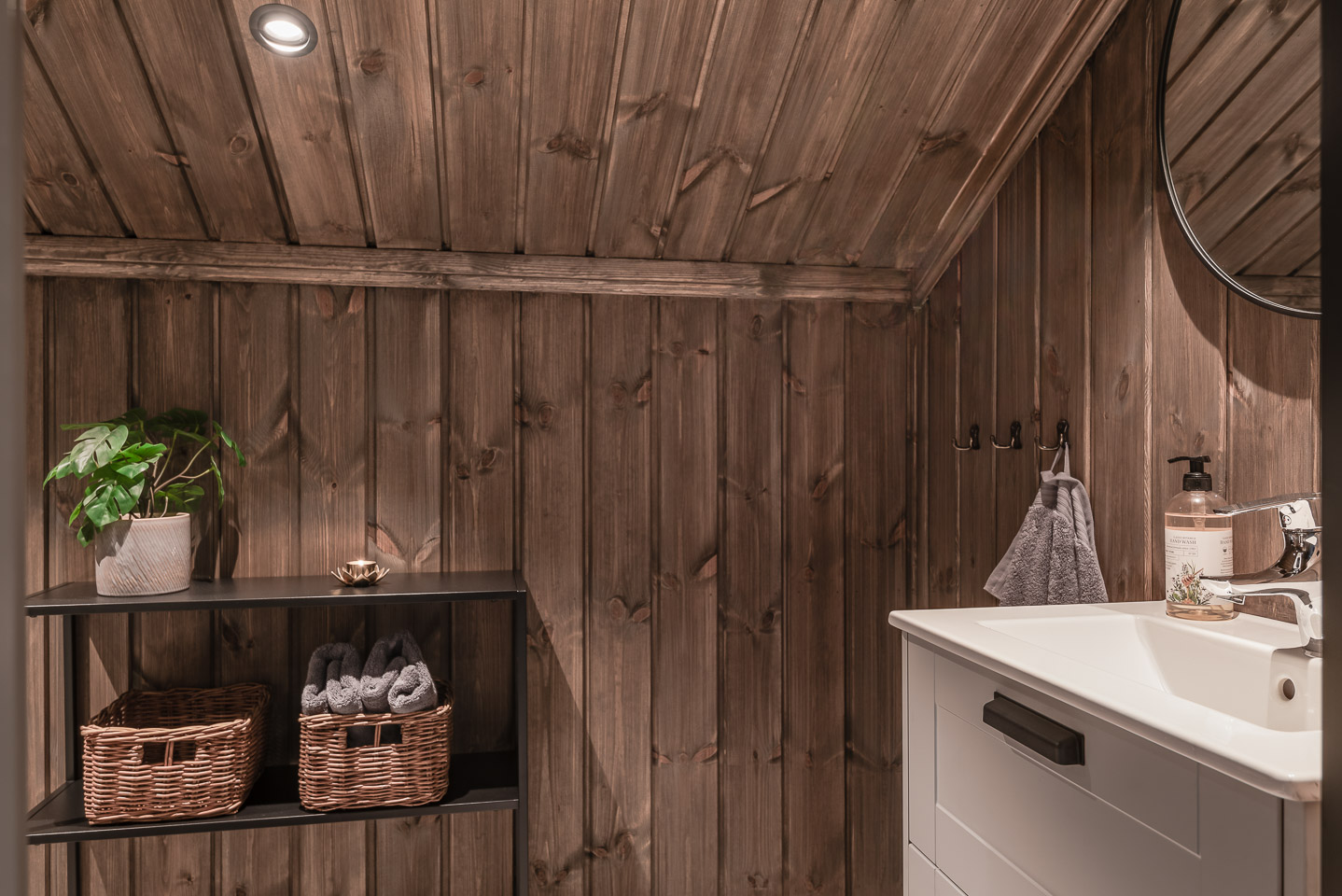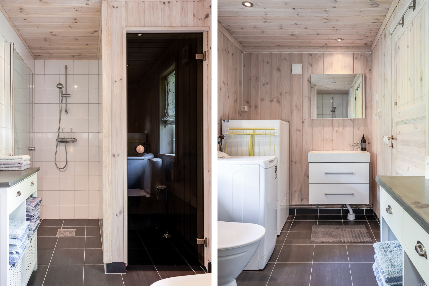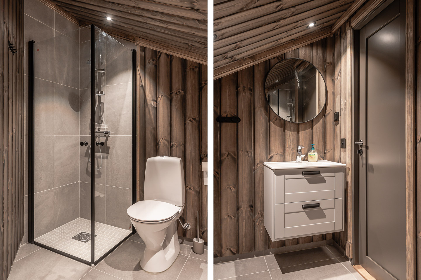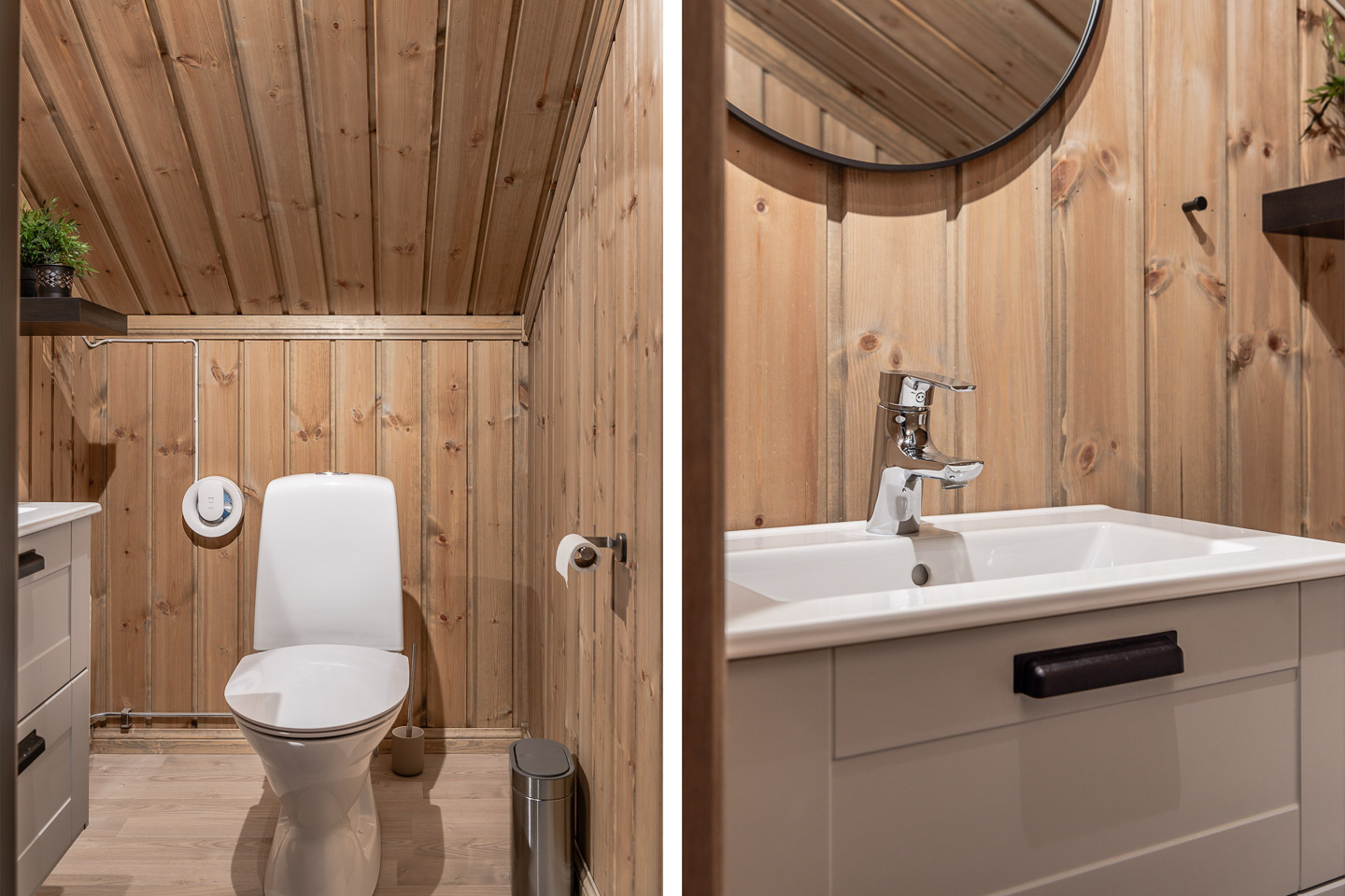 Det finns totalt två badrum i stugan ett på nedervåningen med dusch samt ett på