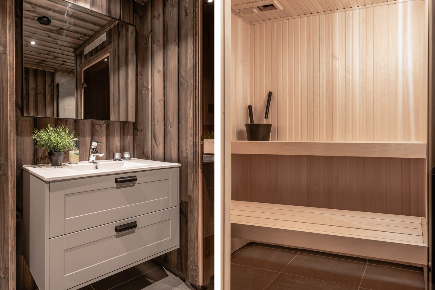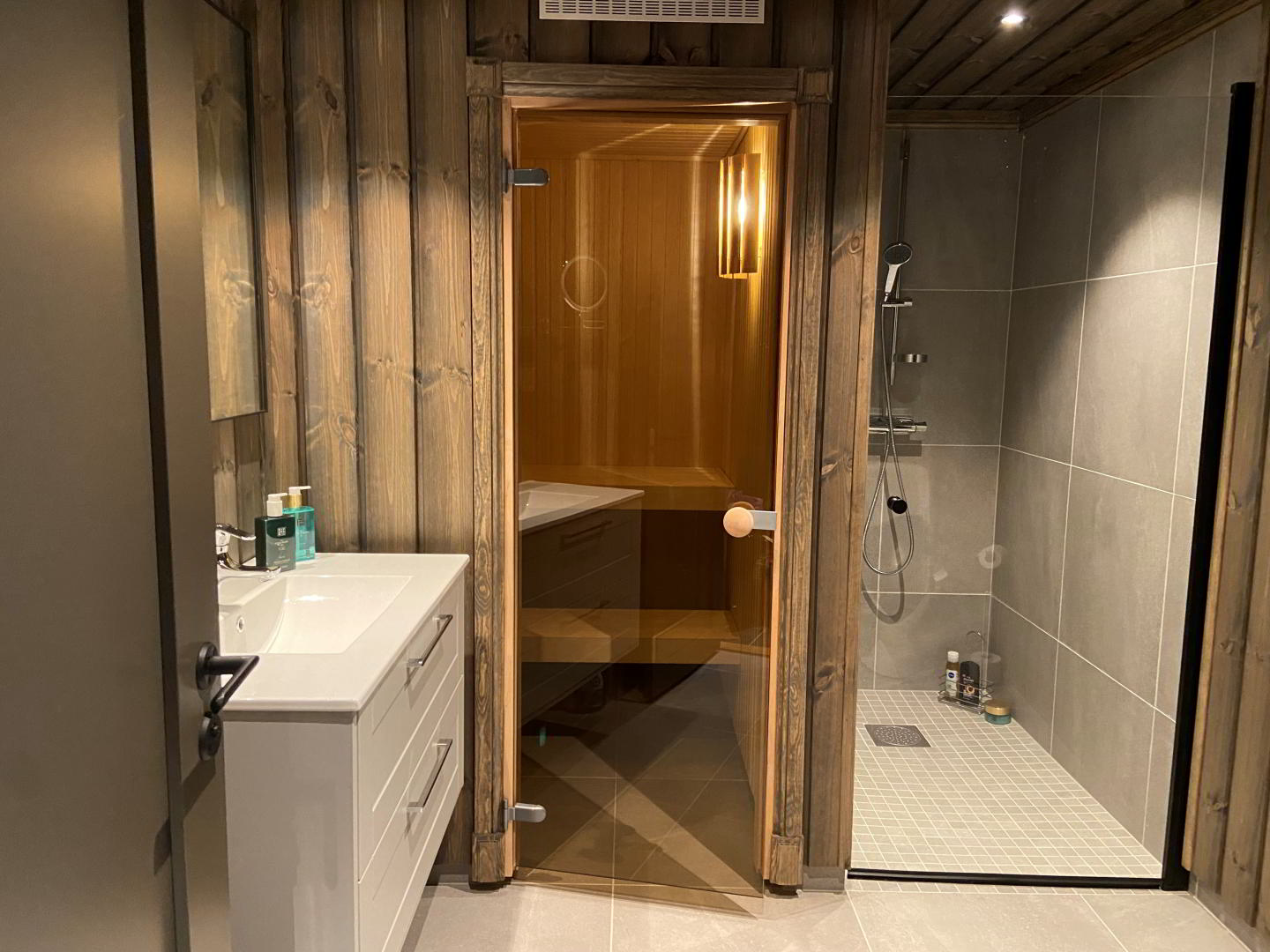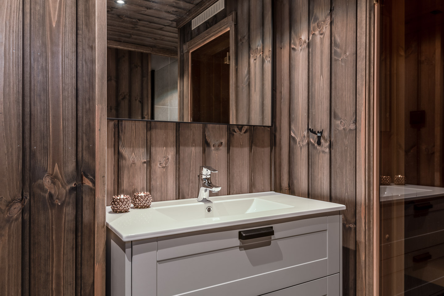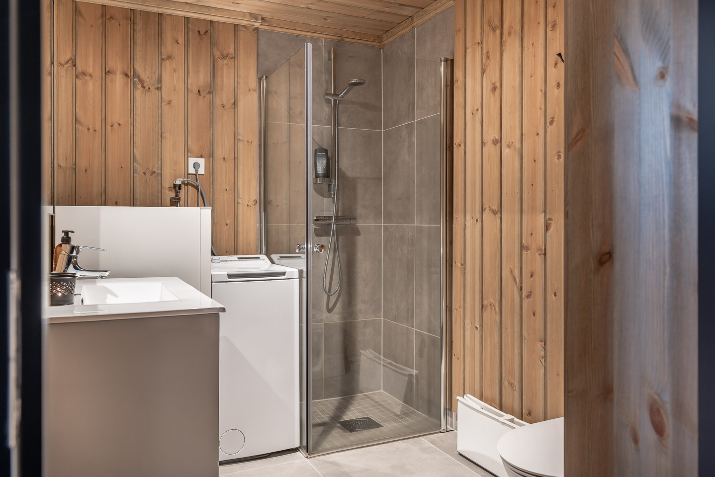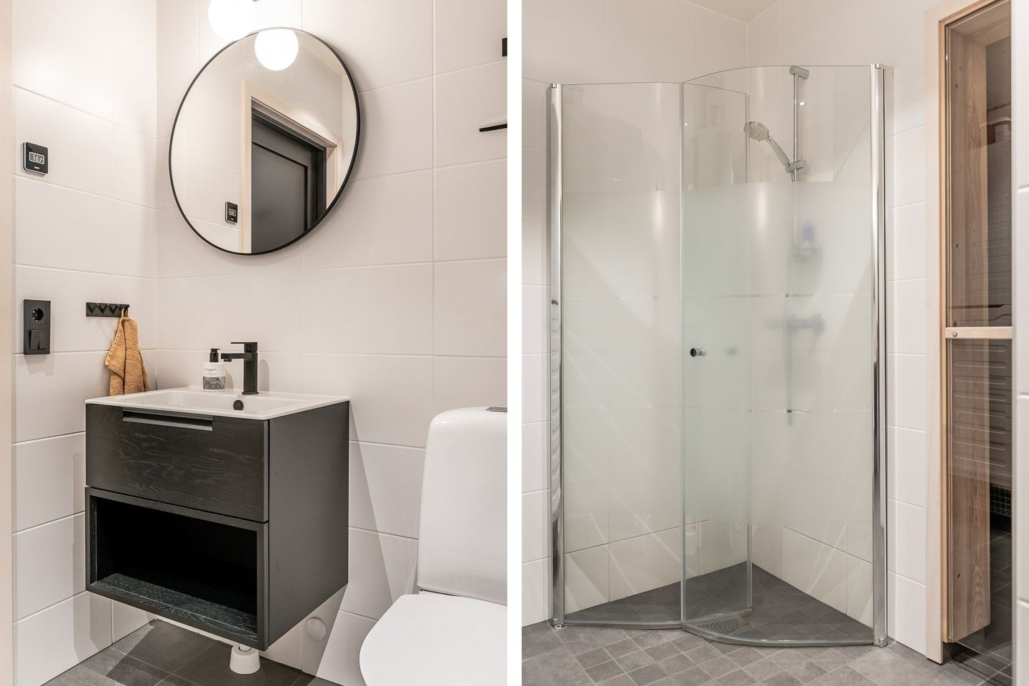 Det finns totalt två badrum i stugan ett på nedervåningen med dusch samt ett på
