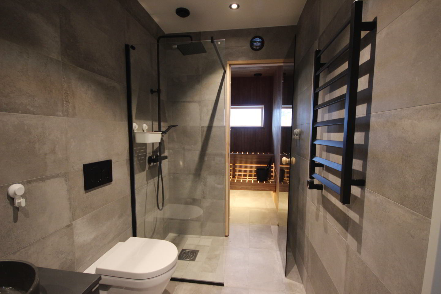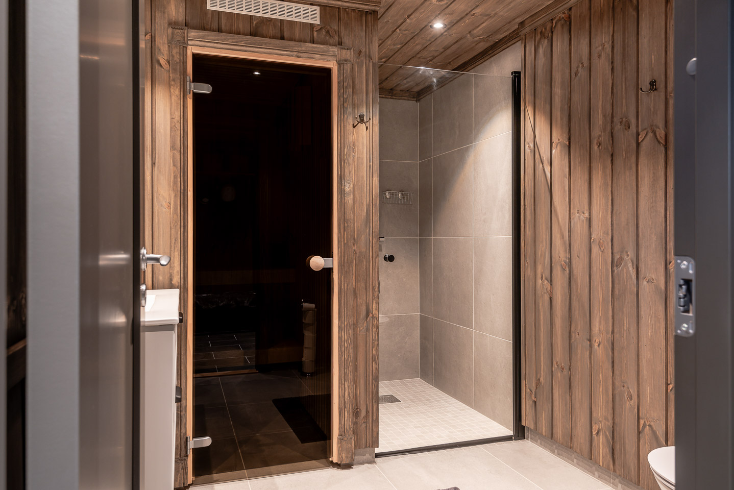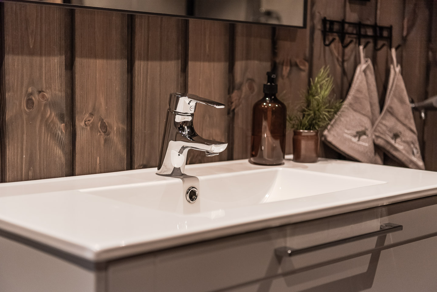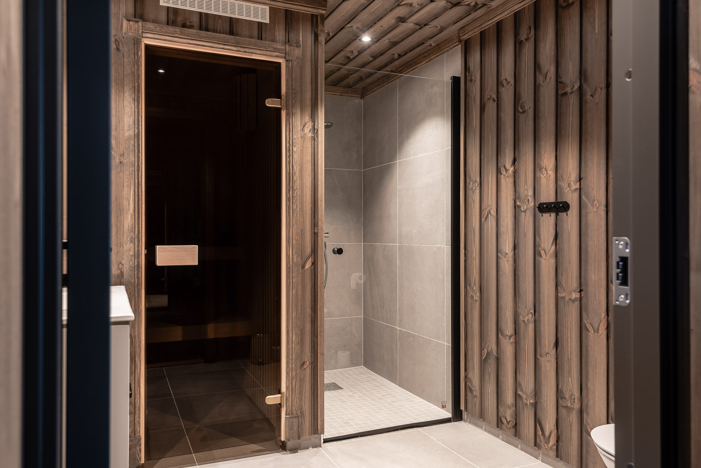 Det finns totalt två badrum i stugan ett på nedervåningen med dusch samt ett på