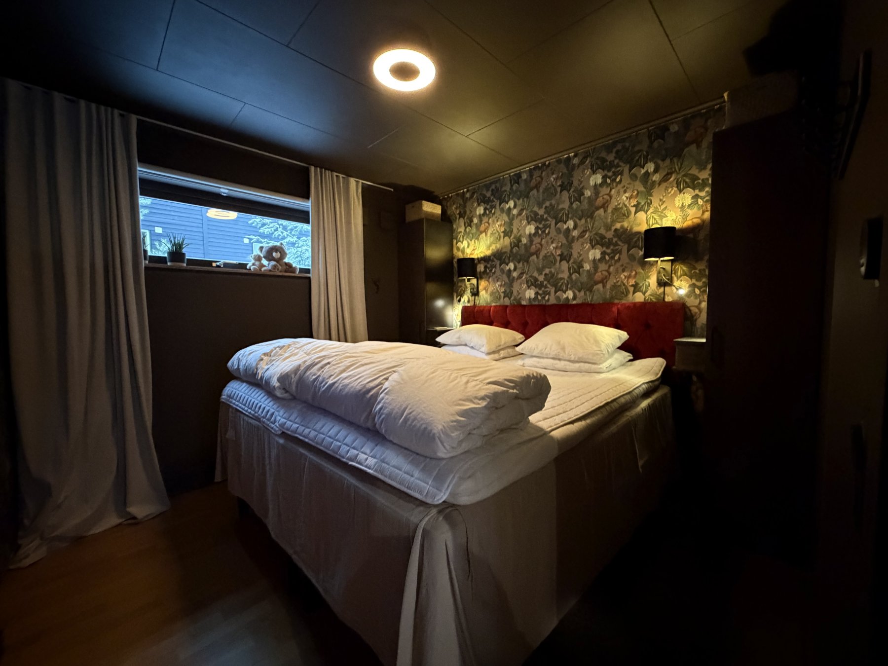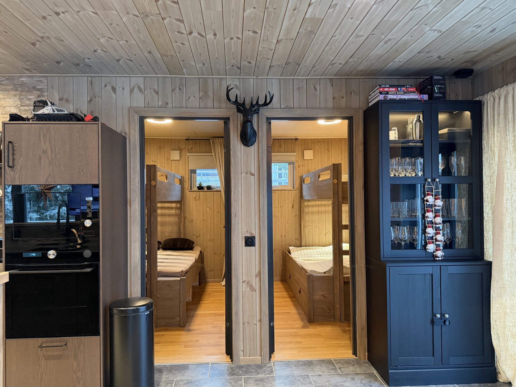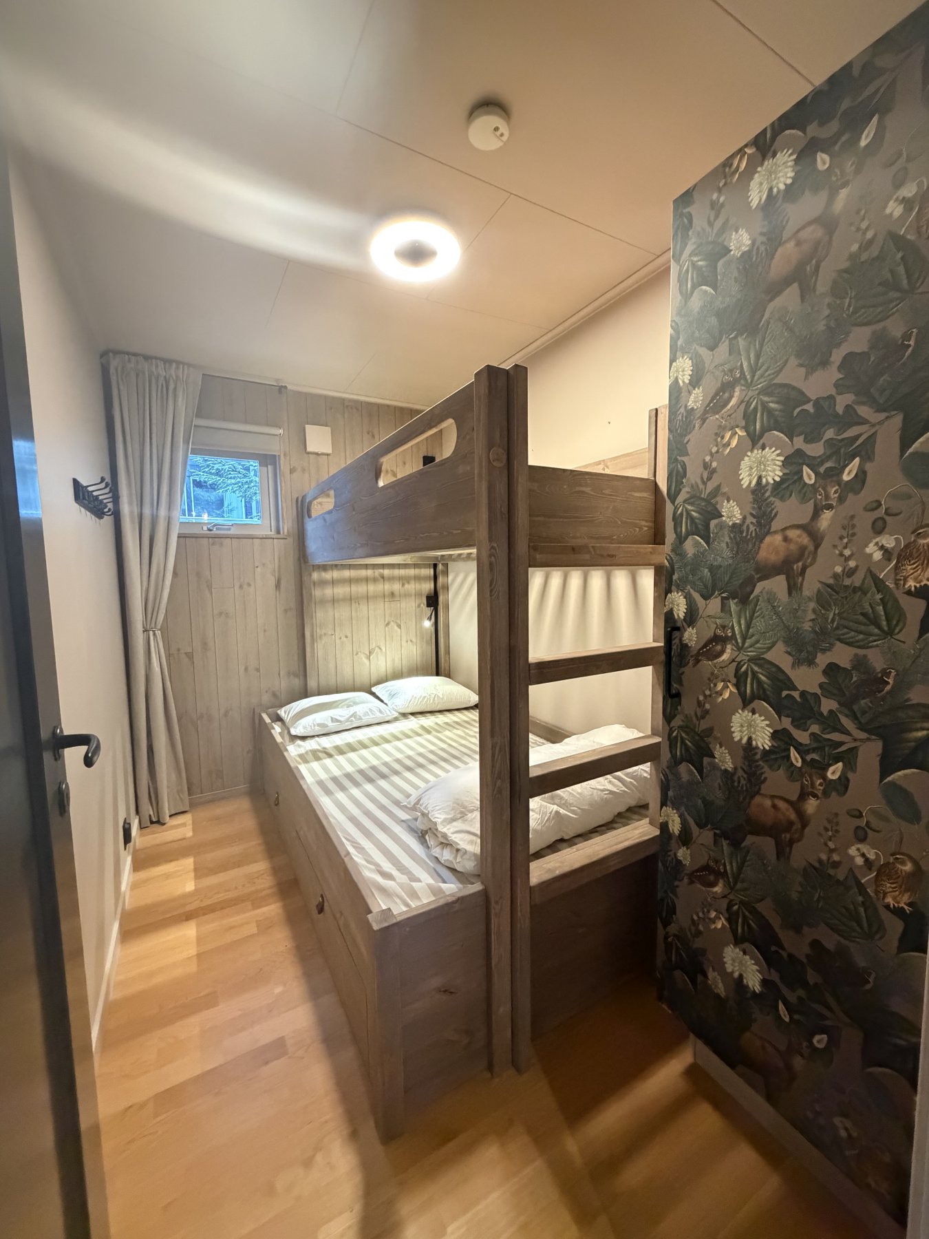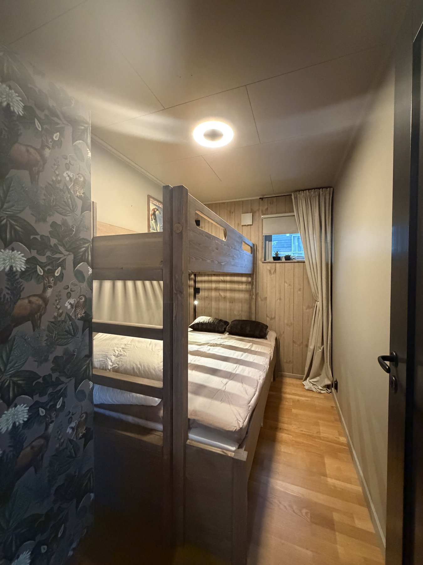 Tre sovrum på första våning, dubbelsäng i det ena och familjesäng m våningssäng i dom två andra. Nedre delen på familjesängarna rymmer fint två personer även om dom bare er 120 cm breda nere.