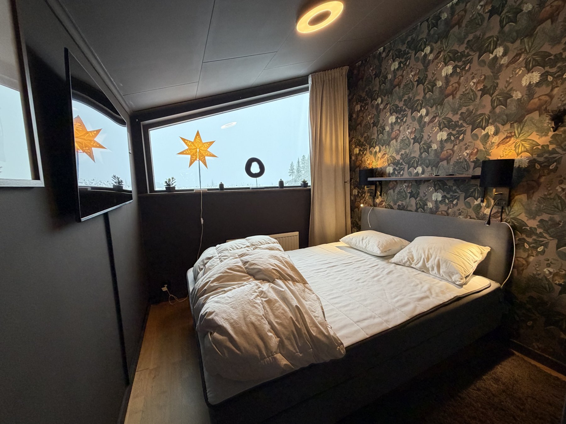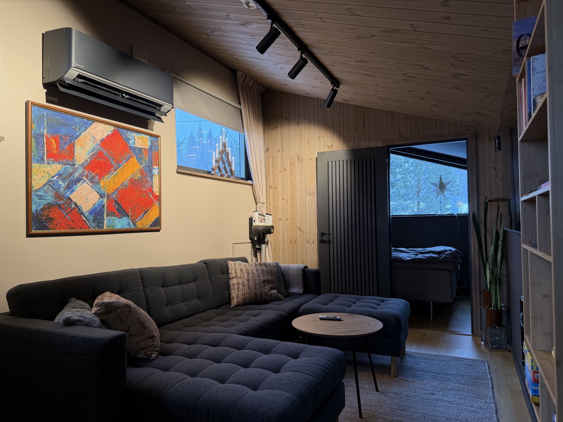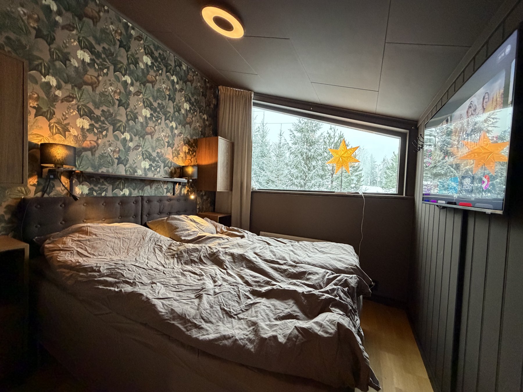 Ett sovrum med dubbelsäng på loftet, med fantastisk utsikt mot Klarälvdalen i norr, allrum med TV och bäddsoffor på loftet, här ges möjlighet till 2 extrabäddar i söder mot Björnbacken..