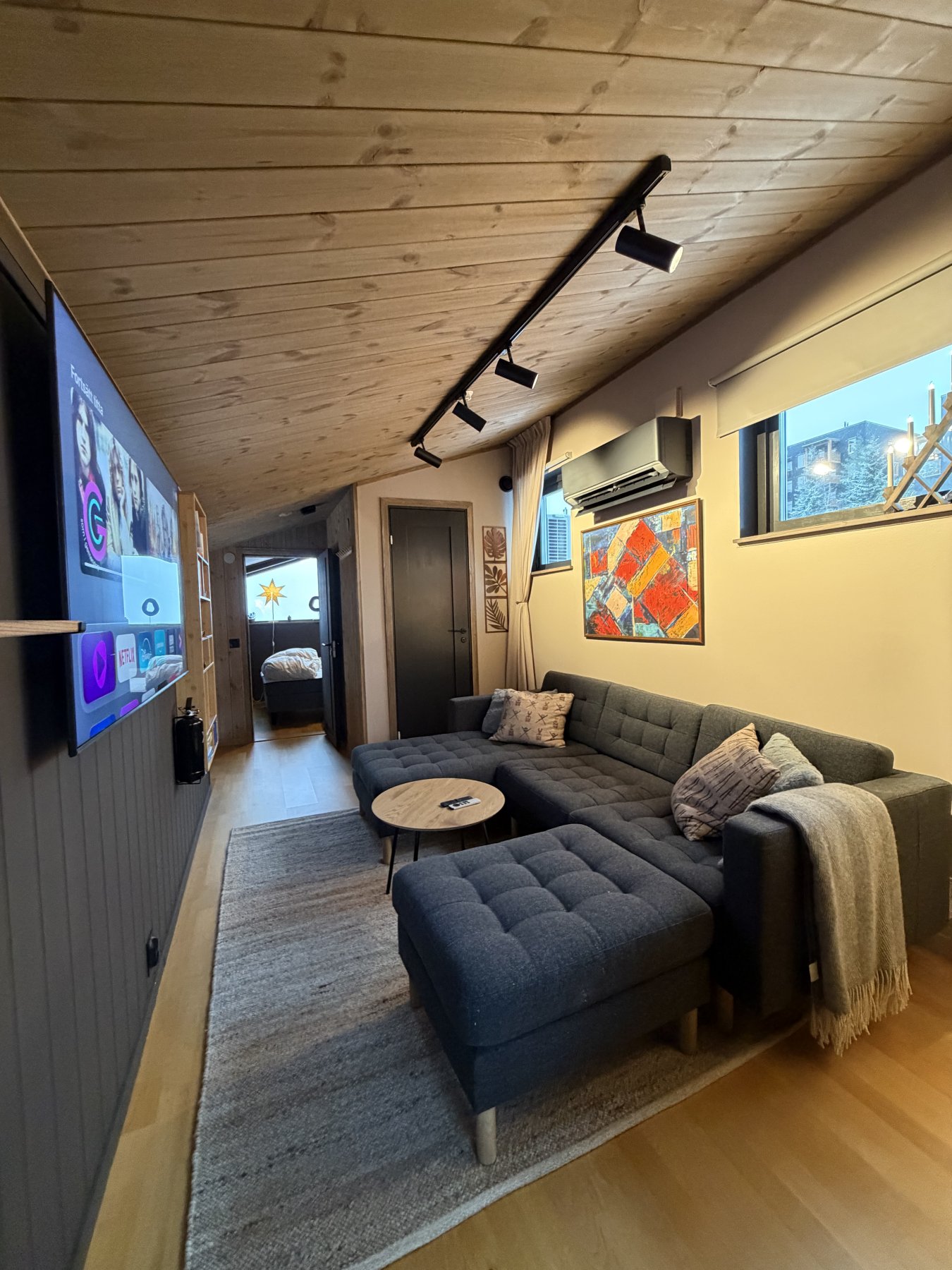 Allrum med TV och bäddsoffor på loftet, här ges möjlighet till 2 extrasängar.