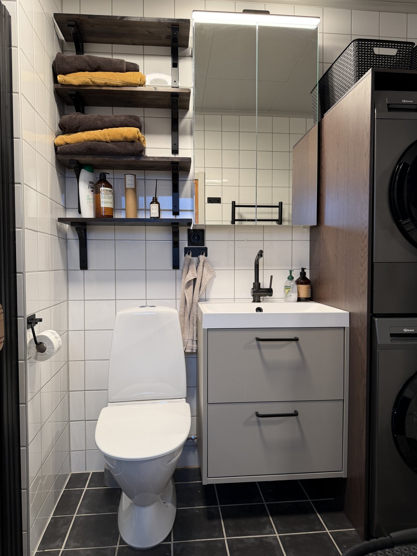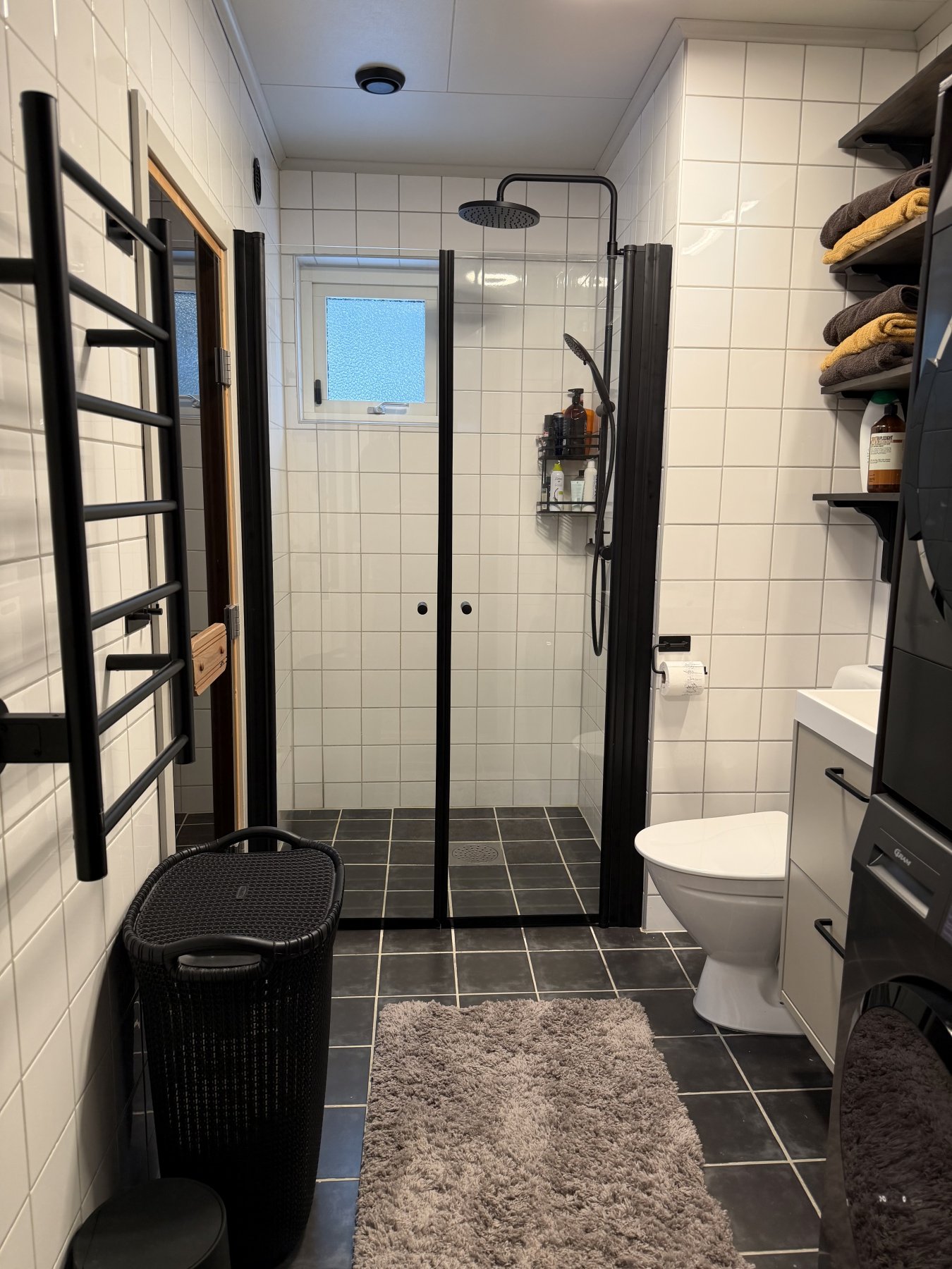 Smakfullt inrett badrum med bastu, wc, dusch och tvättmaskin. Bredvid badrummet finns ett extra duschrum, i andra våningen er det också en extratoalett.