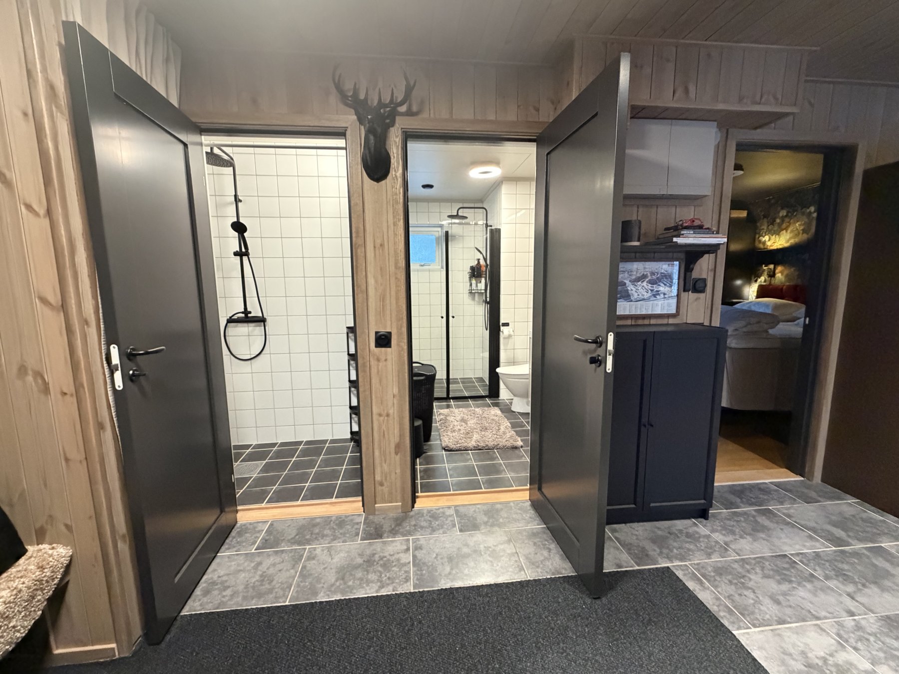 Stor hall med gott om plats för skidkläderna i stora skåp. Klinkers på golvet och torkskåp.