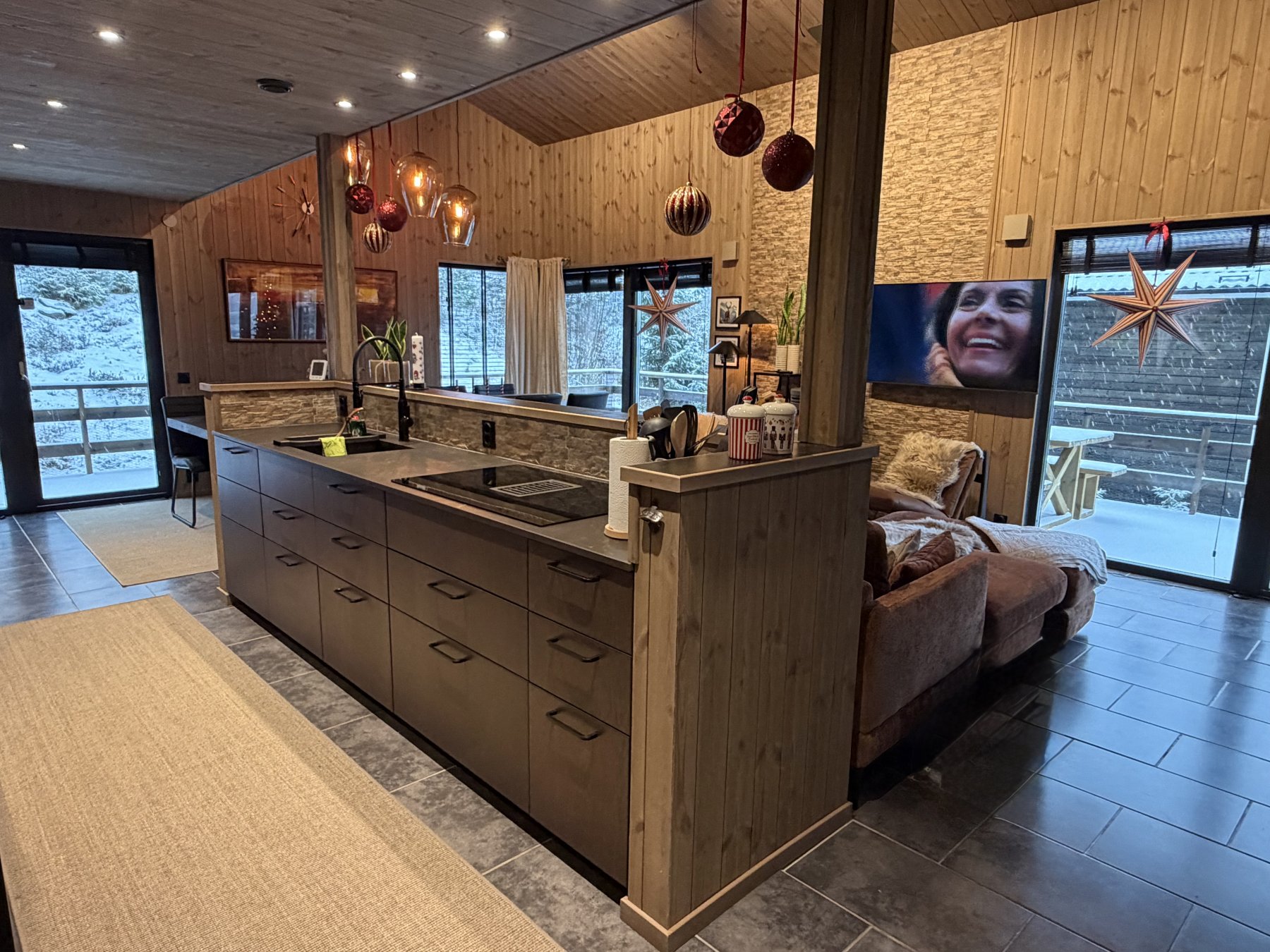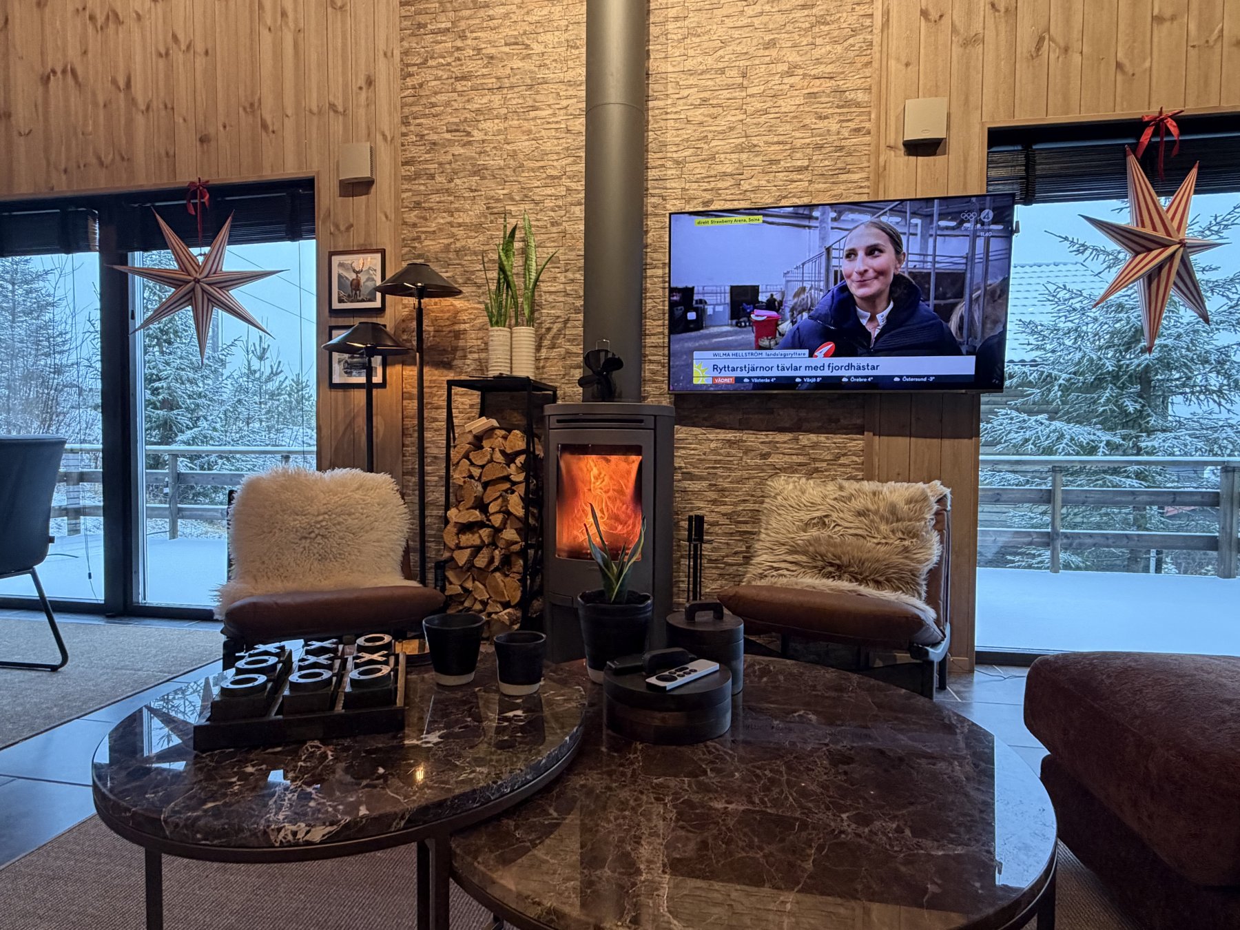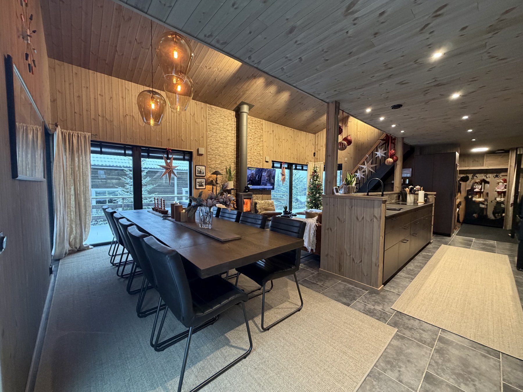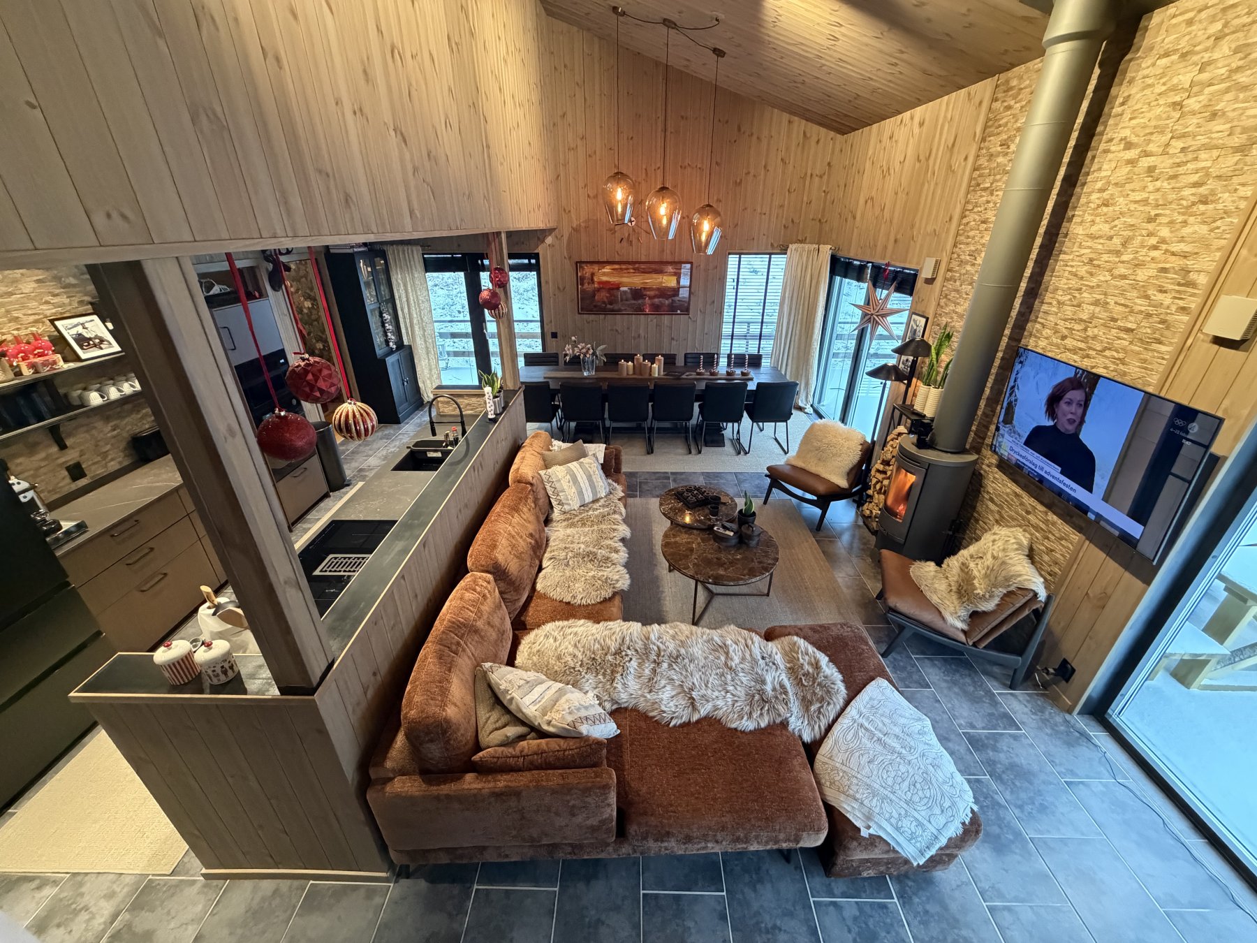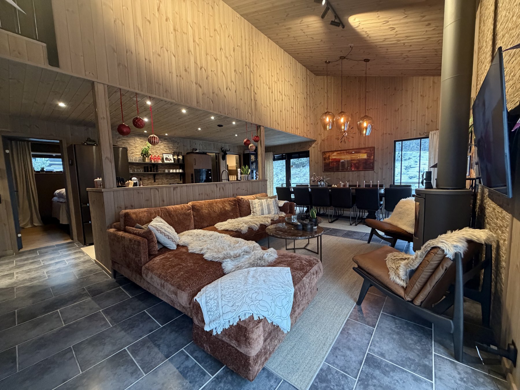 Stor soffa och 40 tummar TV i allrummet. Braskamin mitt i allrummet. Barnsäng och barnstol finns i stugan. Matbord med plats för 12 personer och ett välutrustat öppet kök.