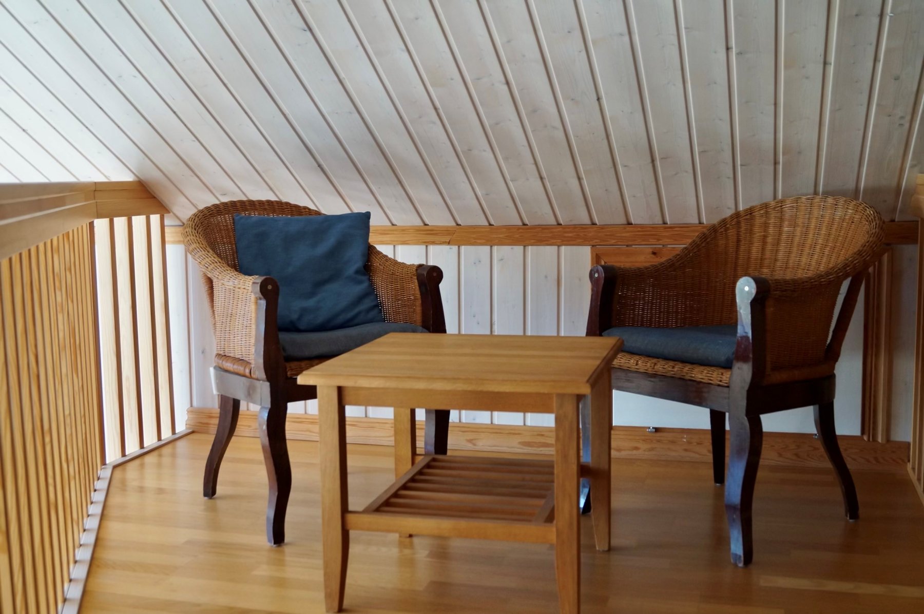 Kök med bl a spis, kyl och frys, diskmaskin, micro, vattenkokare, kaffebryggare, elvisp, brödrost mm. Under trappan finns en hopfällbar barnsäng och barnstol. En tunn madrass finns men ingen kudde eller täcke (tag med eget). Köksmöbel i ek med 8 stolar.
