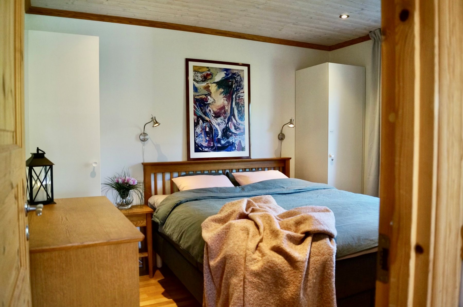 Det finns 3 sovrum, samt bäddsoffa i allrum på 2 vån, med totalt 8+2 bäddar. Det är 3 dubbelsängar 160 cm, en familjesäng med 120 cm skummadrass i botten och 80 cm i överslafen, samt en bäddsoffa.