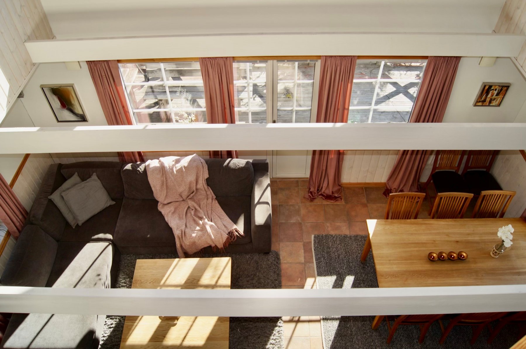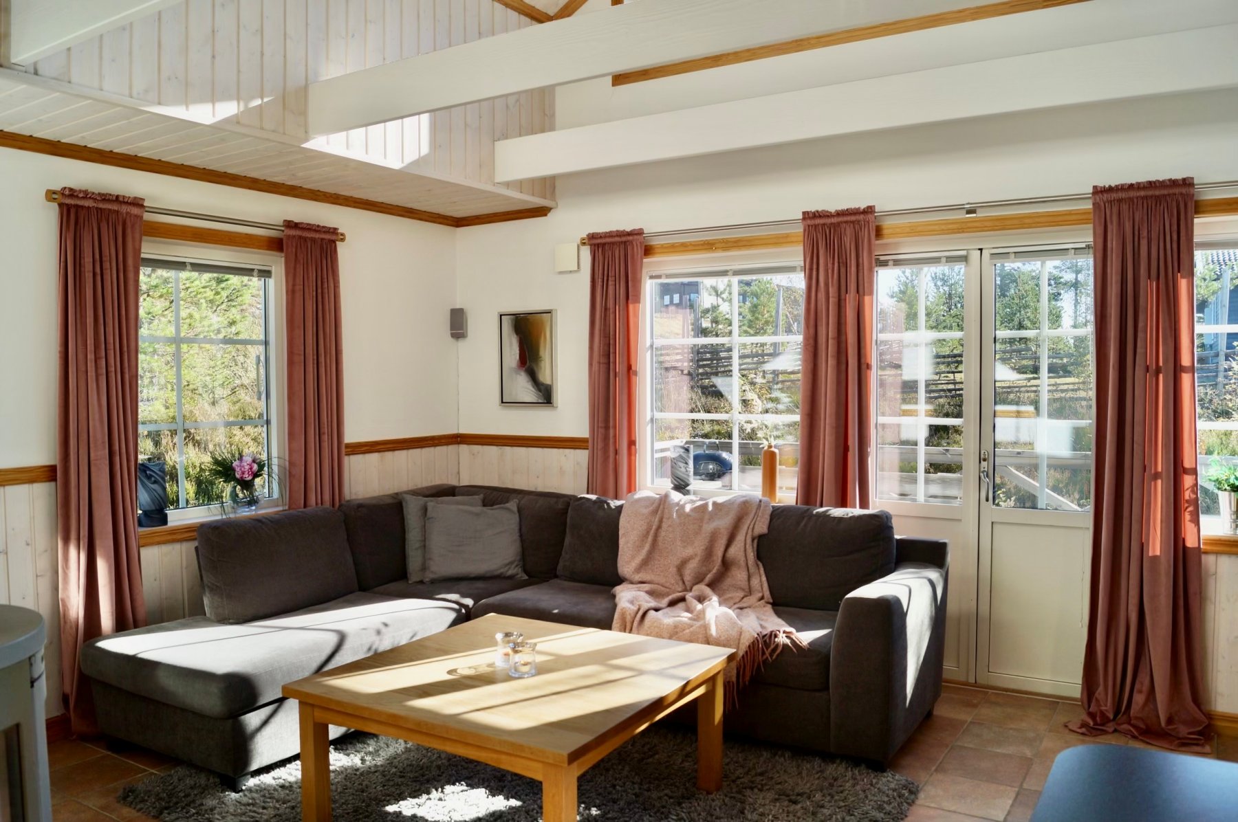 Vidare finns här braskamin, TV, DVD . Hörnsoffa i tyg med gott om plats.