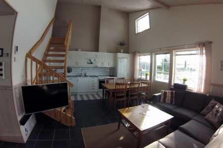 Allrum med hörnsoffa, välutrustat kök, braskamin och TV. Taket är öppet i nock vilket ger en härlig rymd, klinkergolv med golvvärme samt utgång till altan i västerläge. Härifrån har man utsikt över längdspåren på Branäsberget. Det finns totalt 8 köksstolar i stugan, plus en barnstol.