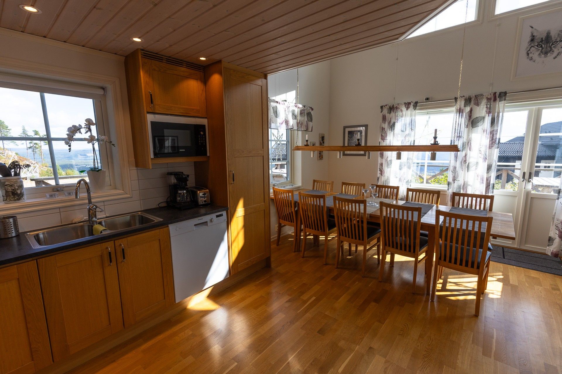 Lättarbetat och mysigt vinkelkök med luckor och lådor av ek och mörk bänkskiva. Till vänster i köket finns kombinerad kyl och frys, Inbyggnadsugn med varmluftsfläkt och spishäll med induktion. Till höger i köket finns inbyggd mikrovågsugn. I köket finns kaffebryggare, vattenkokare, brödrost, mixerstav, våffeljärn, och erforderligt porslin och köksredskap för 12 personer