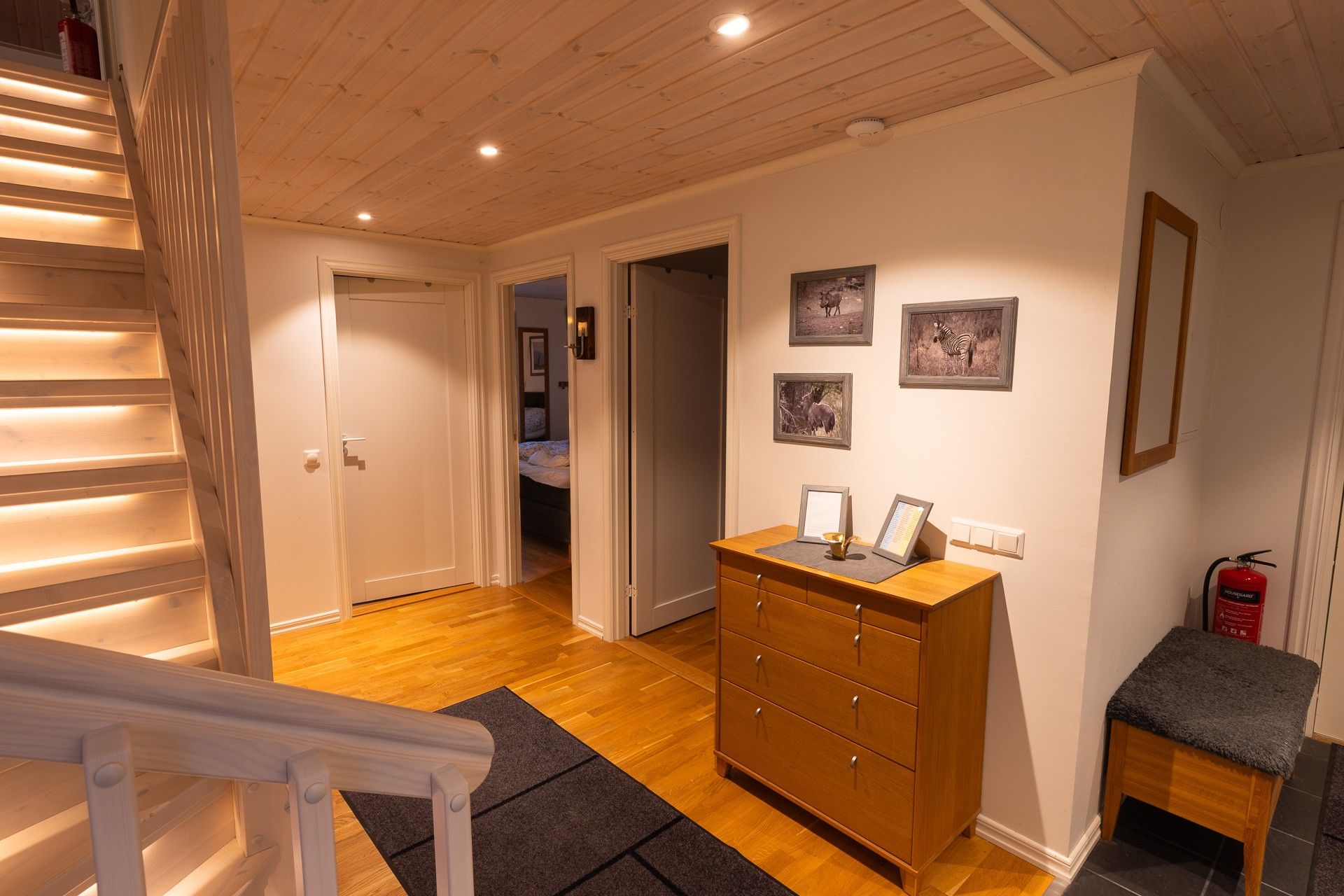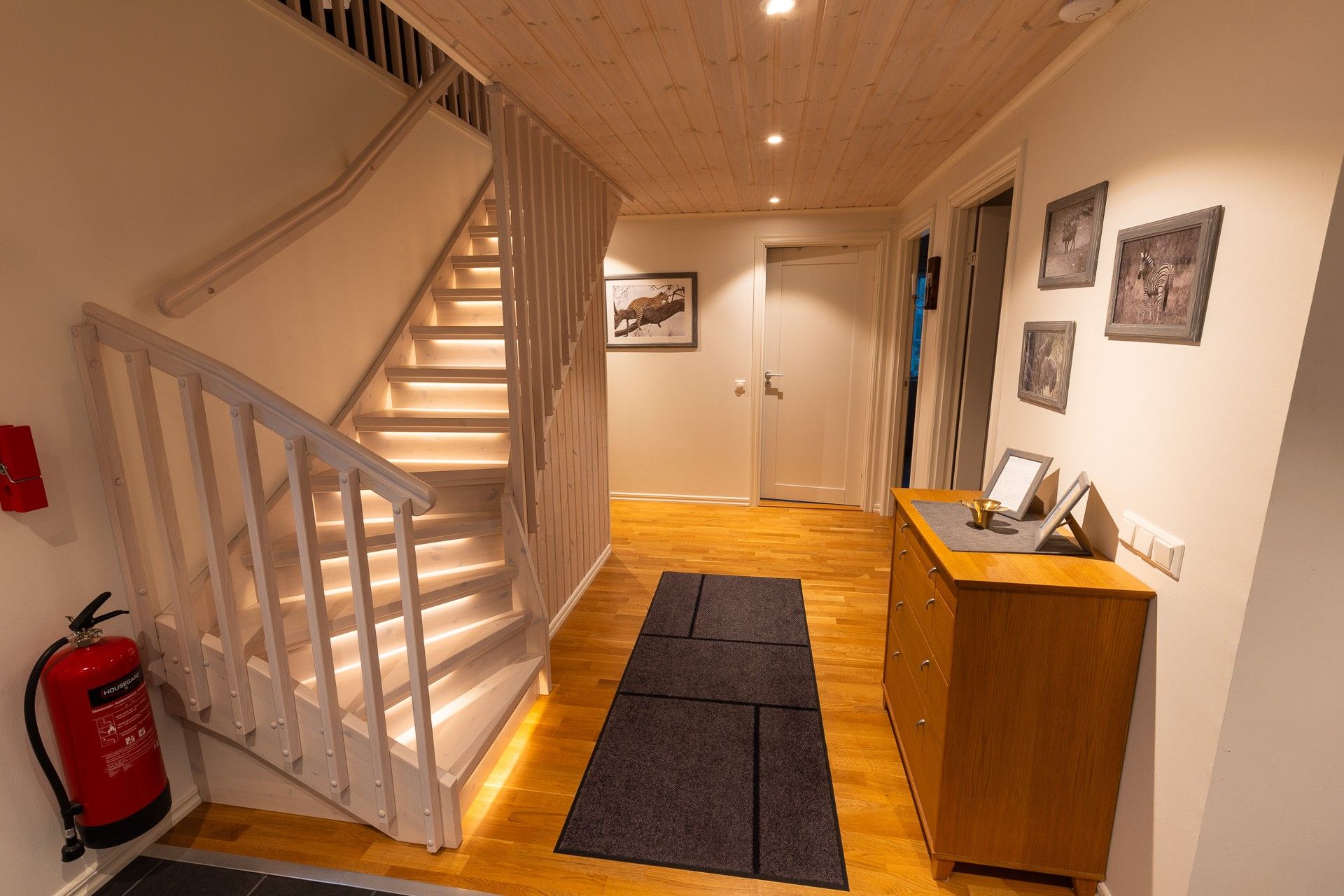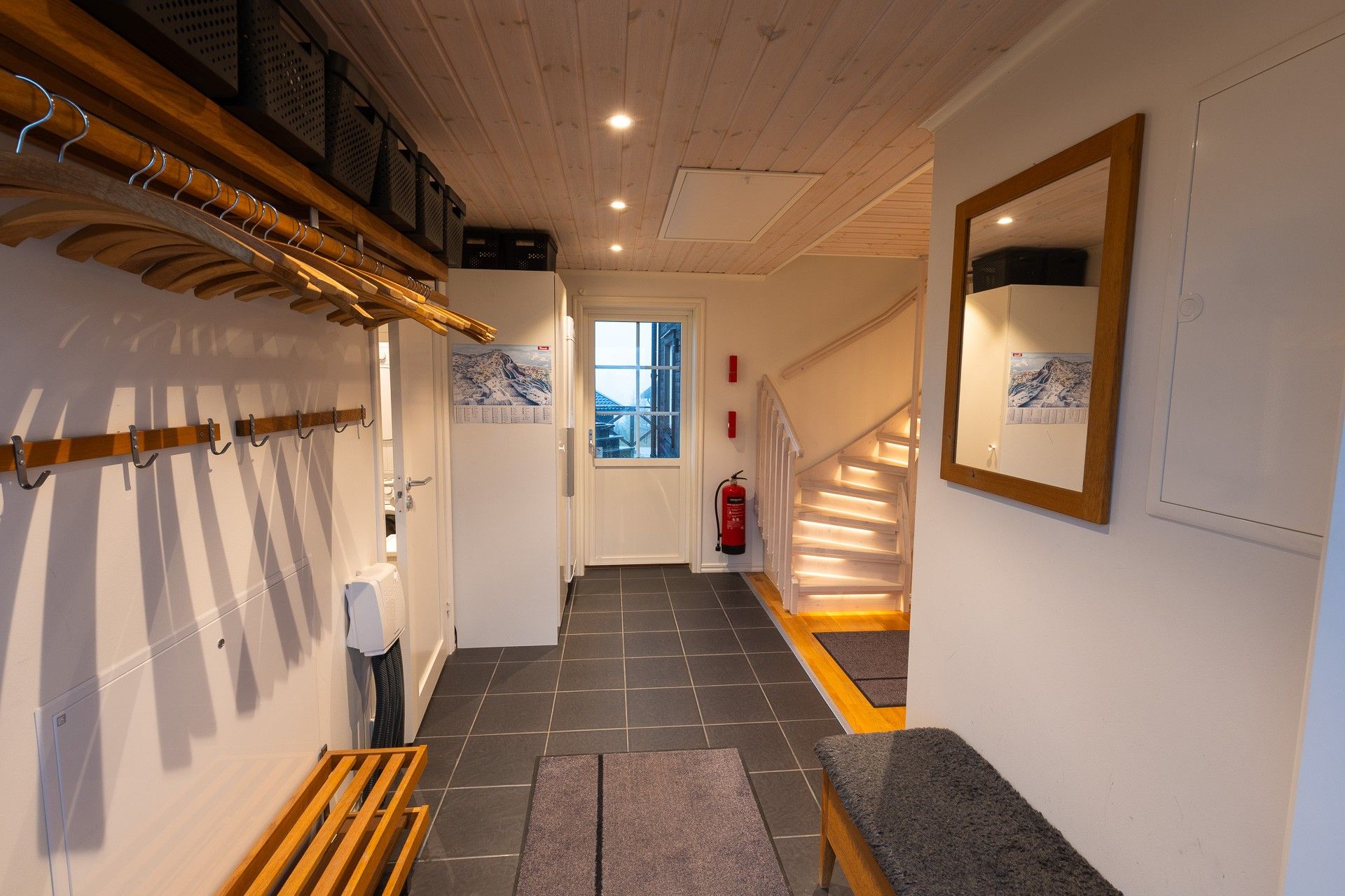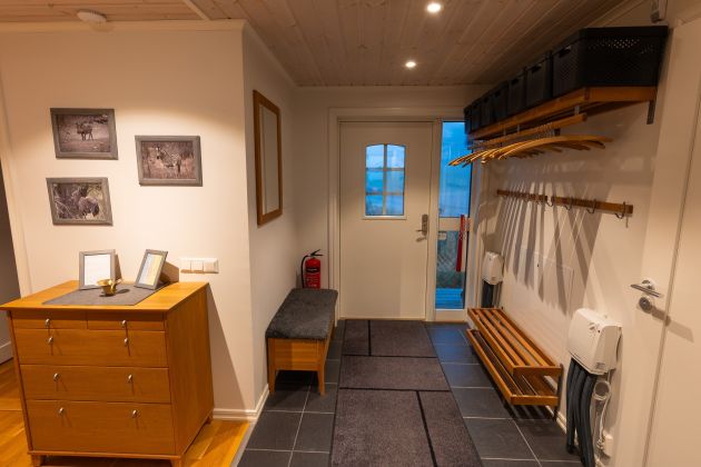 Precis innanför entrédörren finns en sittkoffert av ek med fårull på ovansidan, skön att sitta på för att ta av sig skor och pjäxor. Mittemot finns bred och generös hatthylla och skoställ och 2st pjäxtorkar. I hallen som har golv av klinker så finns även torkskåp och städskåp. Längre in i hallen finns även en rymlig byrå av ek.