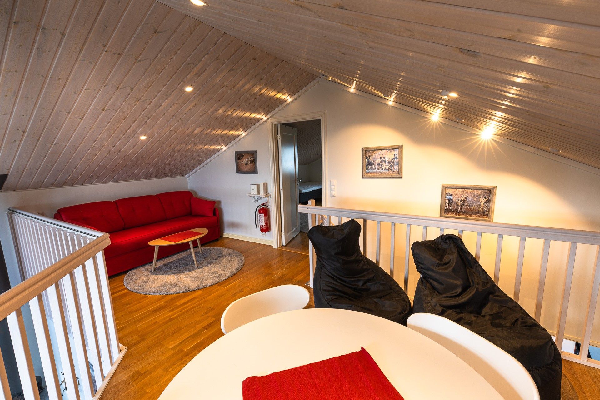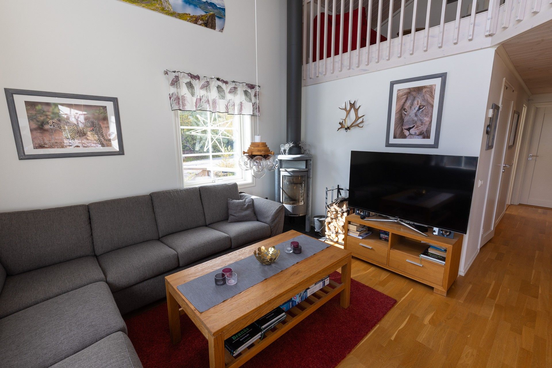 Här finns en generös grå hörnsoffa med läsbelysning och uplight samt rund braskamin i grå täljsten med eldstadsverktyg och vedställ av svart metall. Därtill finns även 55” TV med Apple-tv-box som står på en byrå av ek som innehåller diverse spel och kortlek mm. På golvet ligger en klarröd ryamatta under soffbordet av oljad ek. Över soffbordet hänger en skeppsinspirerad lampa av ek.