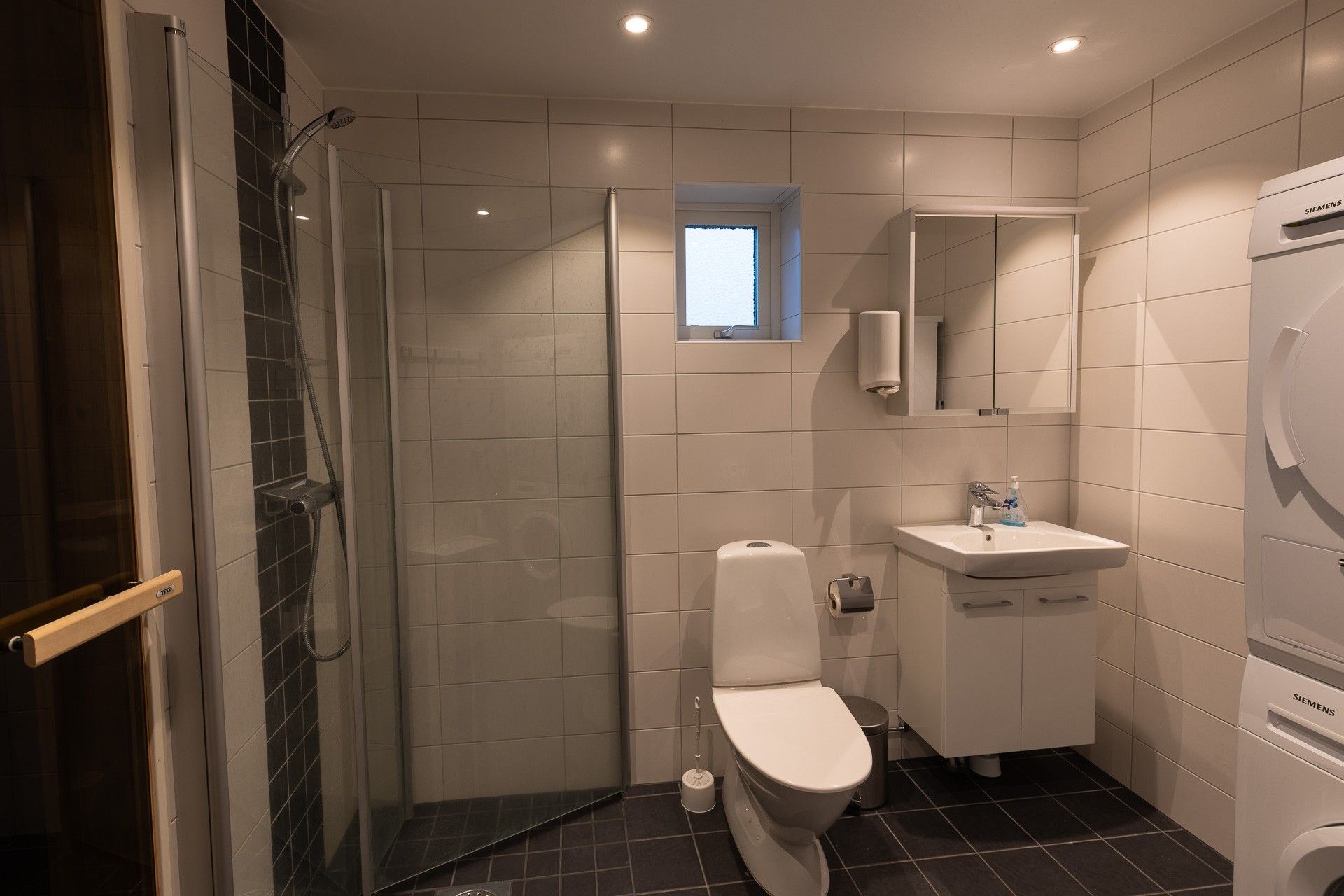 Det finns 2st helkaklade badrum med klinkergolv på nedervåningen i huset. Det stora badrummet är beläget vid entrehallen som även har en fin och rymlig bastu i anslutning till badrummet som även innehåller tvättmaskin och torktumlare.