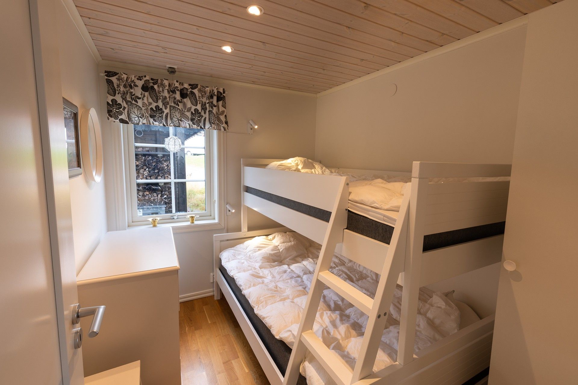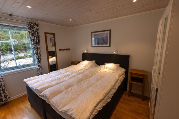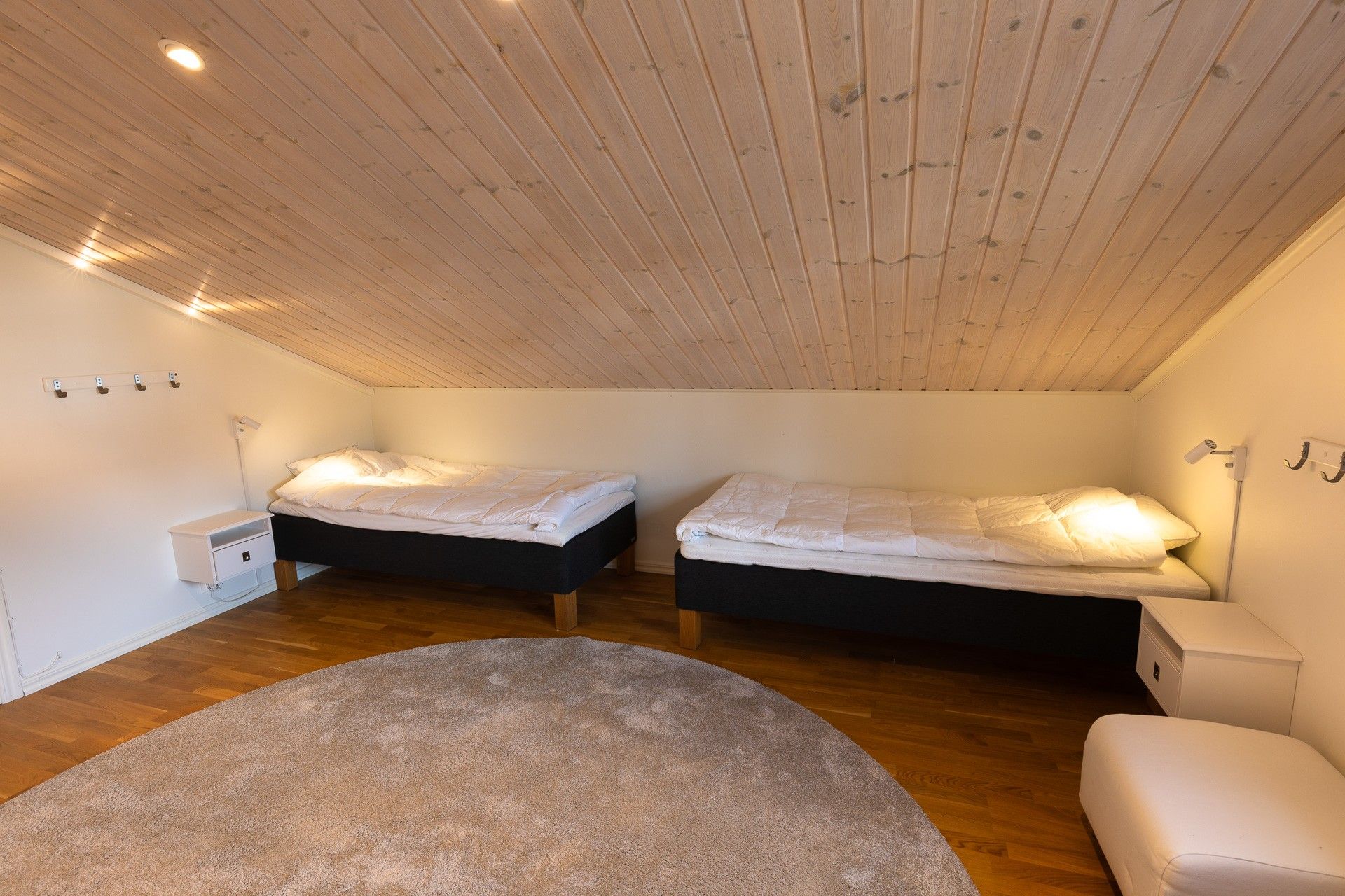 Det finns 4st sovrum i huset, 3st belägna på nedervåningen och ett på övervåningen. På nedervåningen är 2 av sovrummen utrustade med fjällsängar med 120cm bädd nertill och 90cm bädd upptill och en rymlig byrå i vardera rum för klädförvaring. På nedervåningen finns även ett större sovrum med kontinentalsäng 200x180cm med sängbord av ek och vidbyggd klädgarderob. På övervåningen finns ett stort sovrum med 4st 90cm sängar med sängbord vid varje bädd. I varje sovrum finns speglar och sänglampor vid varje säng. På loftet på övervåningen finns även en bäddsoffa med 2 bäddar i.