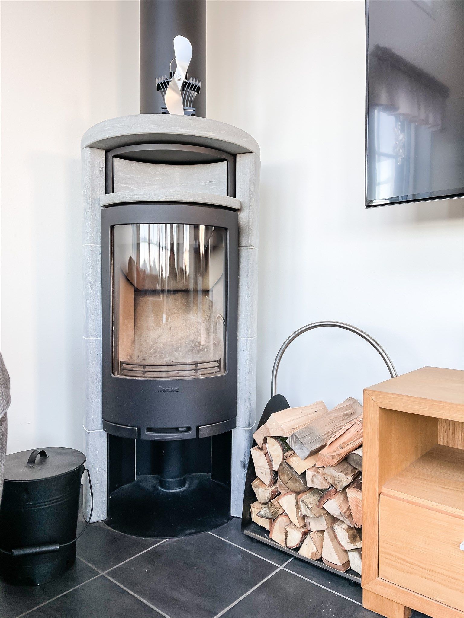 Detta är det större allrummet med soffa, tv och braskamin. Rummet går ihop med köket samt matplats då det är en öppen planlösning. Där finns även en större högtalare som styrs via bluetooth.
