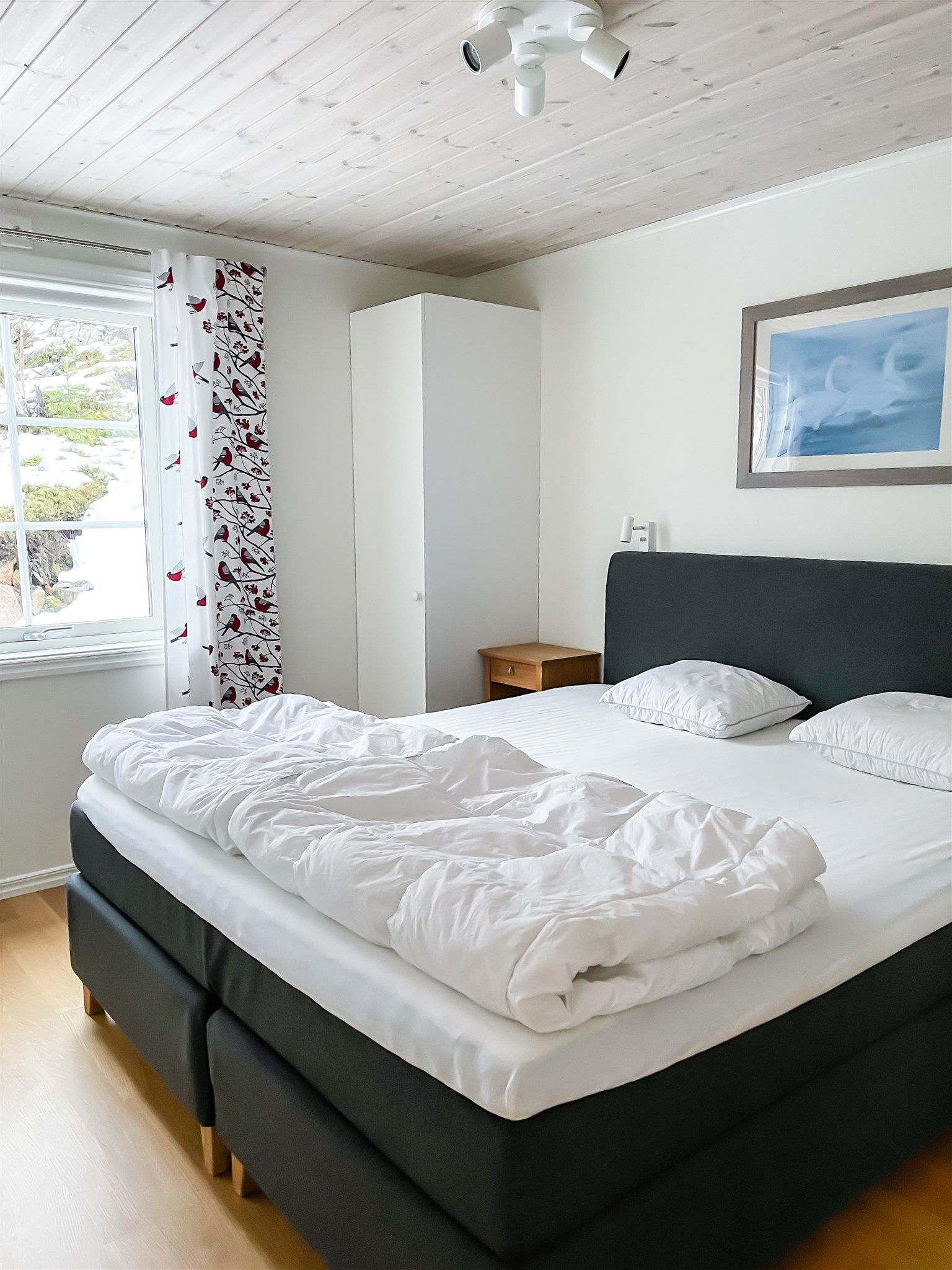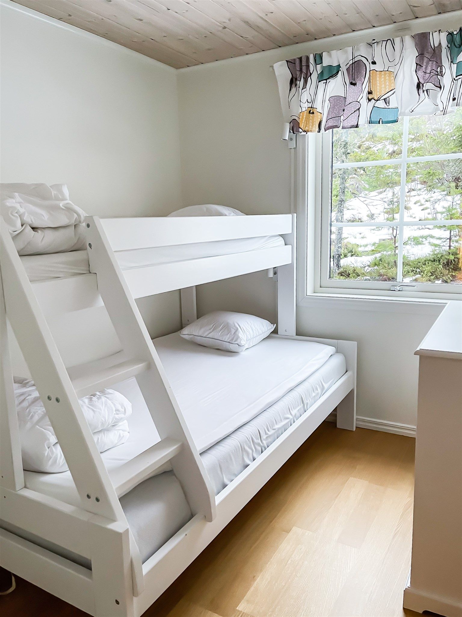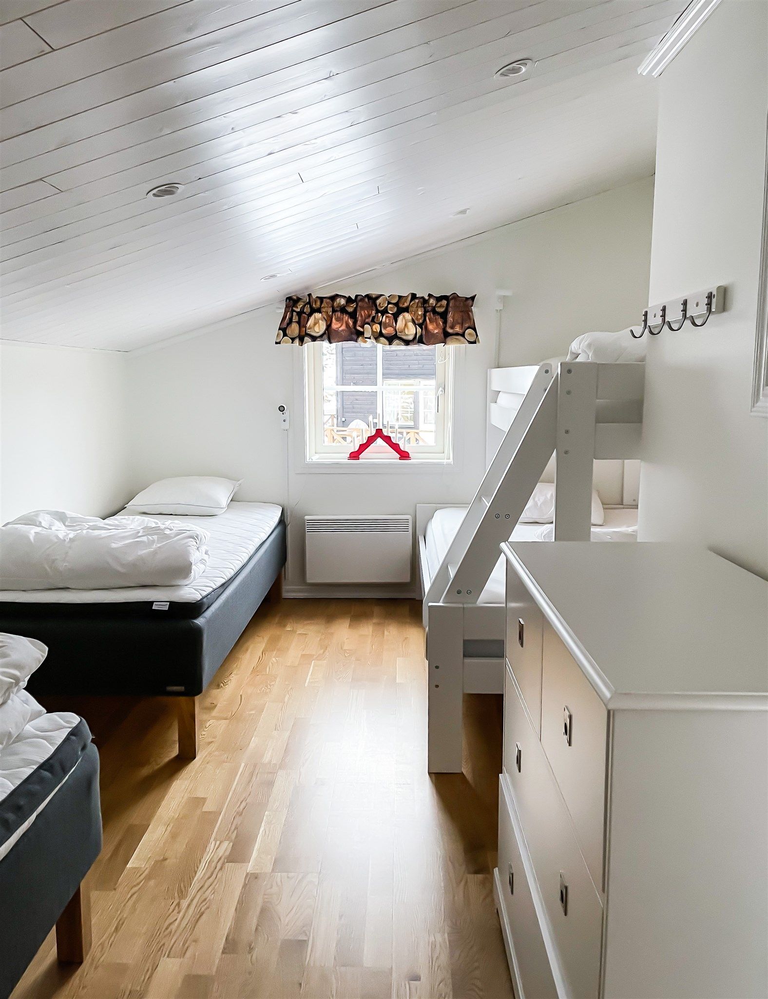 På övervåningen finns två sovrum, med en dubbelsäng samt två enkelsängar i varje rum (8 personer). I ett av sovrummen finns det möjlighet att placera in en barnsäng.