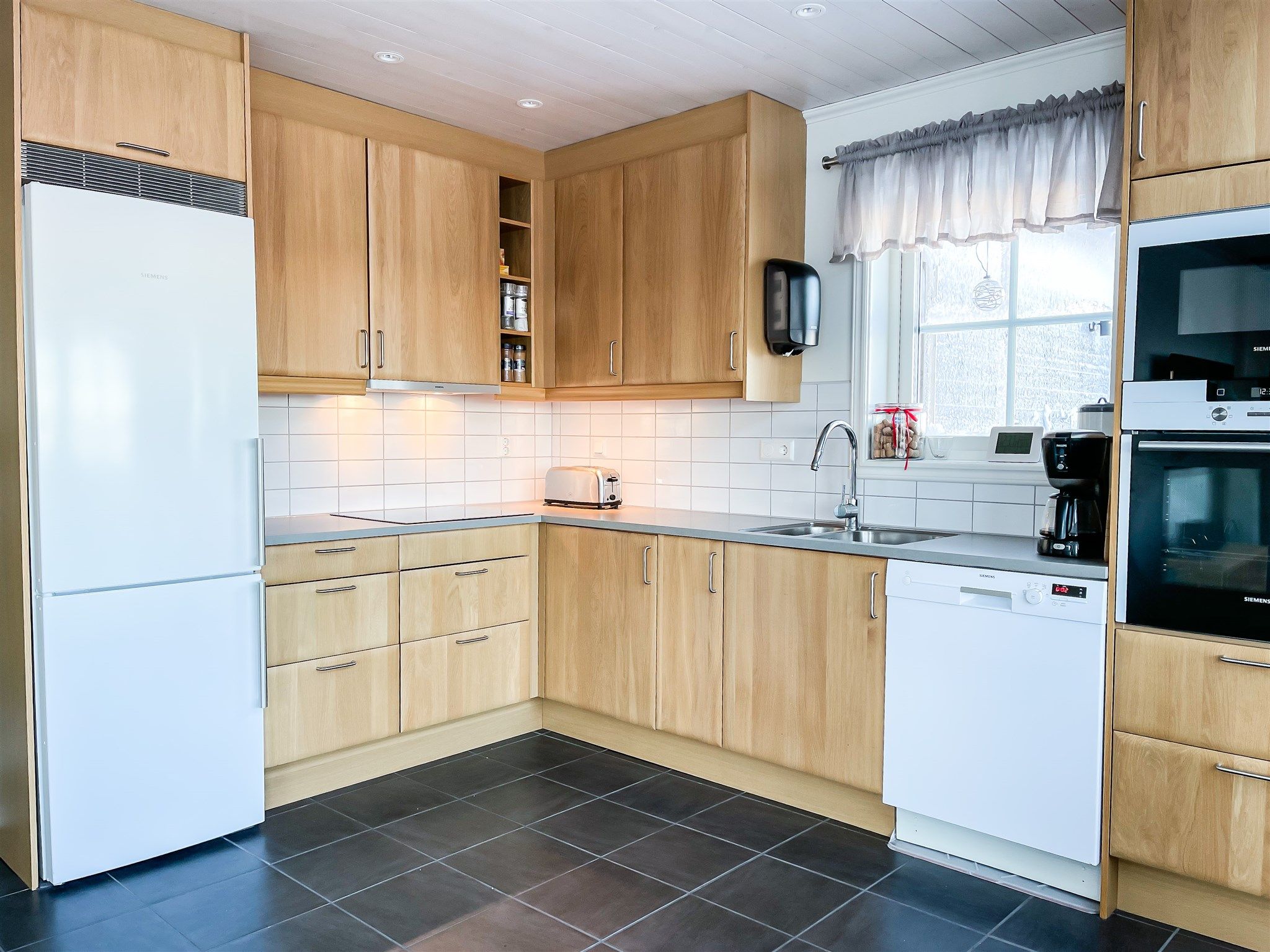 Köket är väl utrustat. Det finns en stor kyl/frys, skafferi, diskmaskin, Ugn och micro, induktionsspishäll med fläkt, kaffebryggare, vattenkokare, brödrost, brödrost, stavmixer, elvisp och våffeljärn.