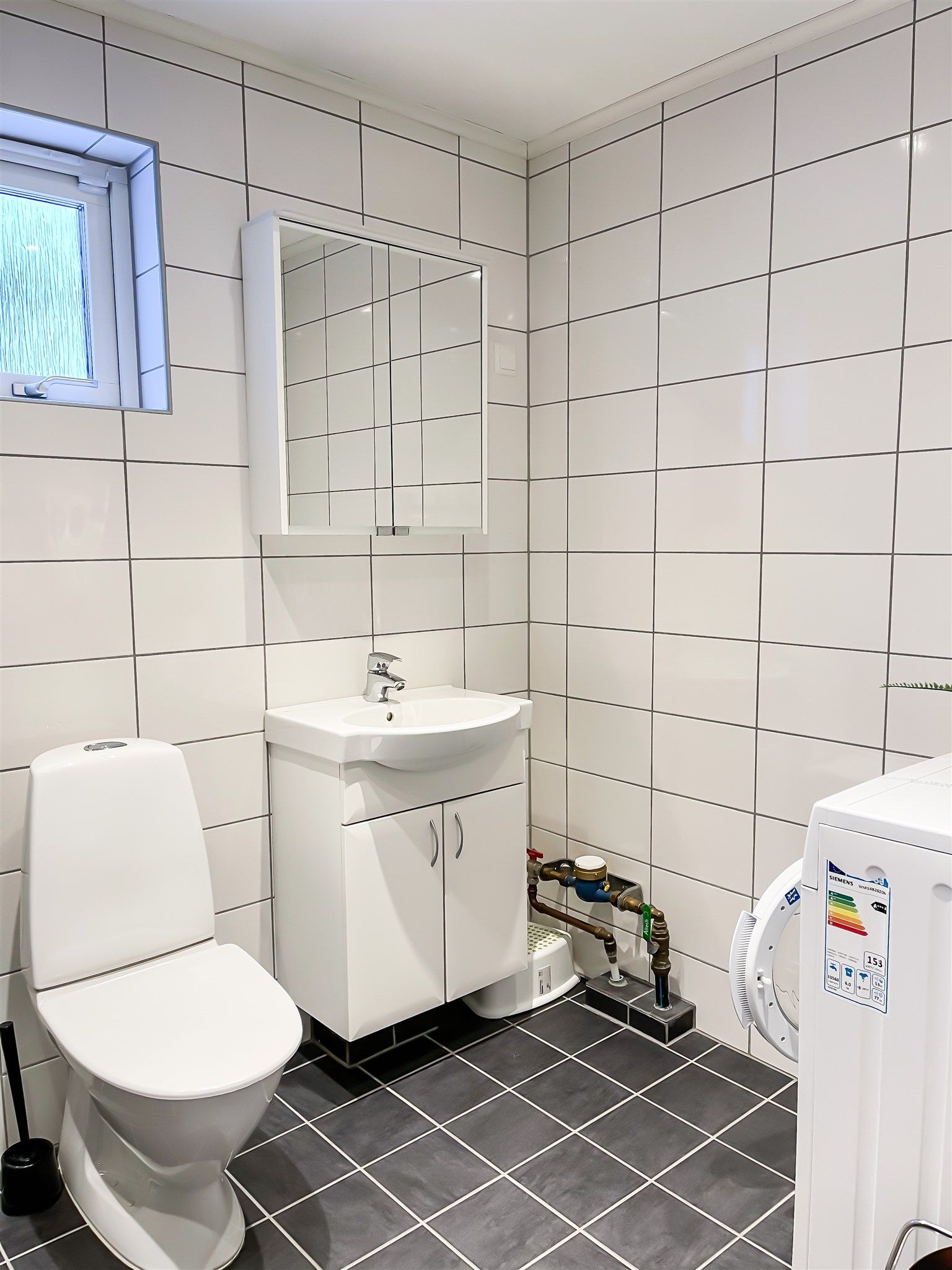 På bottenvåningen finns ett stort badrum med dusch och bastu, det finns också en mindre toalett med dusch vid allrummet.