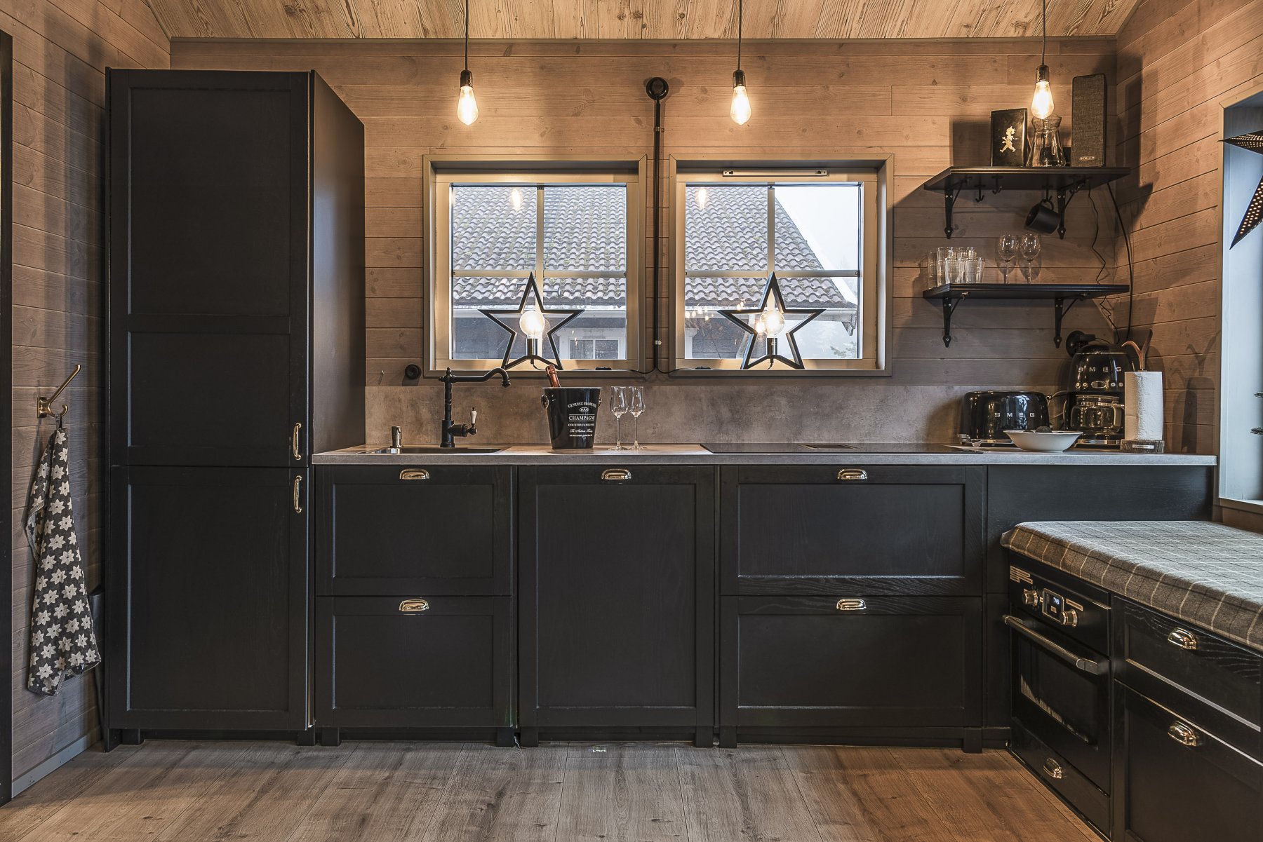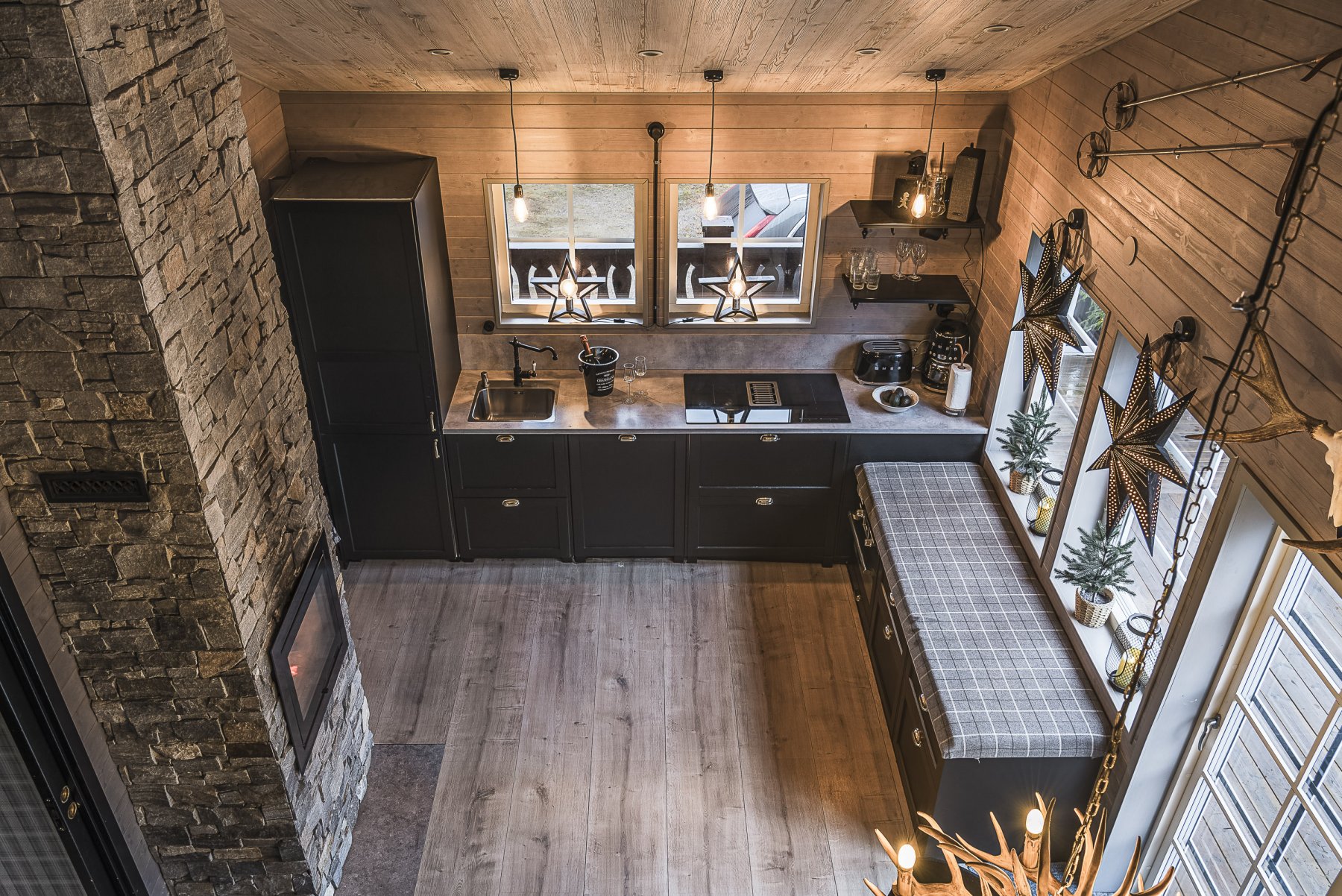 Köksdelen av allrummet har full takhöjd upp i nock vilket ger ett rymligt rum, här finns också kaminen som bidrar till mysfaktorn. Väggarna är klädda med träpanel och golv och tak har nya ytskikt i träutseende. Ett rejält bord med sittbänkar som rymmer 8 personer finns i mitten av rummet. Köket är modernt med kyl/frys, induktionshäll, kombinerad ugn/micro, kaffebryggare, vattenkokare, våffeljärn och brödrost.