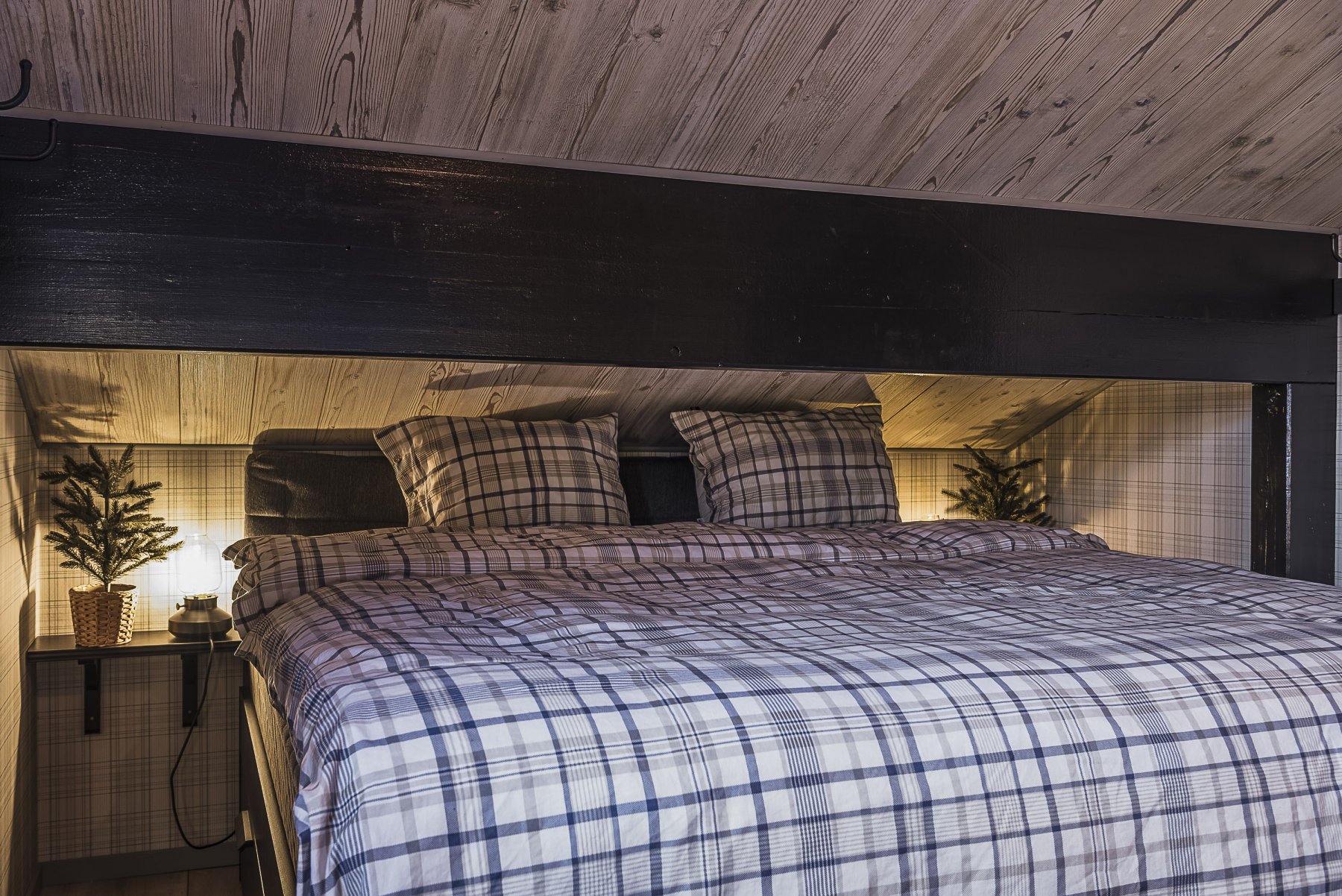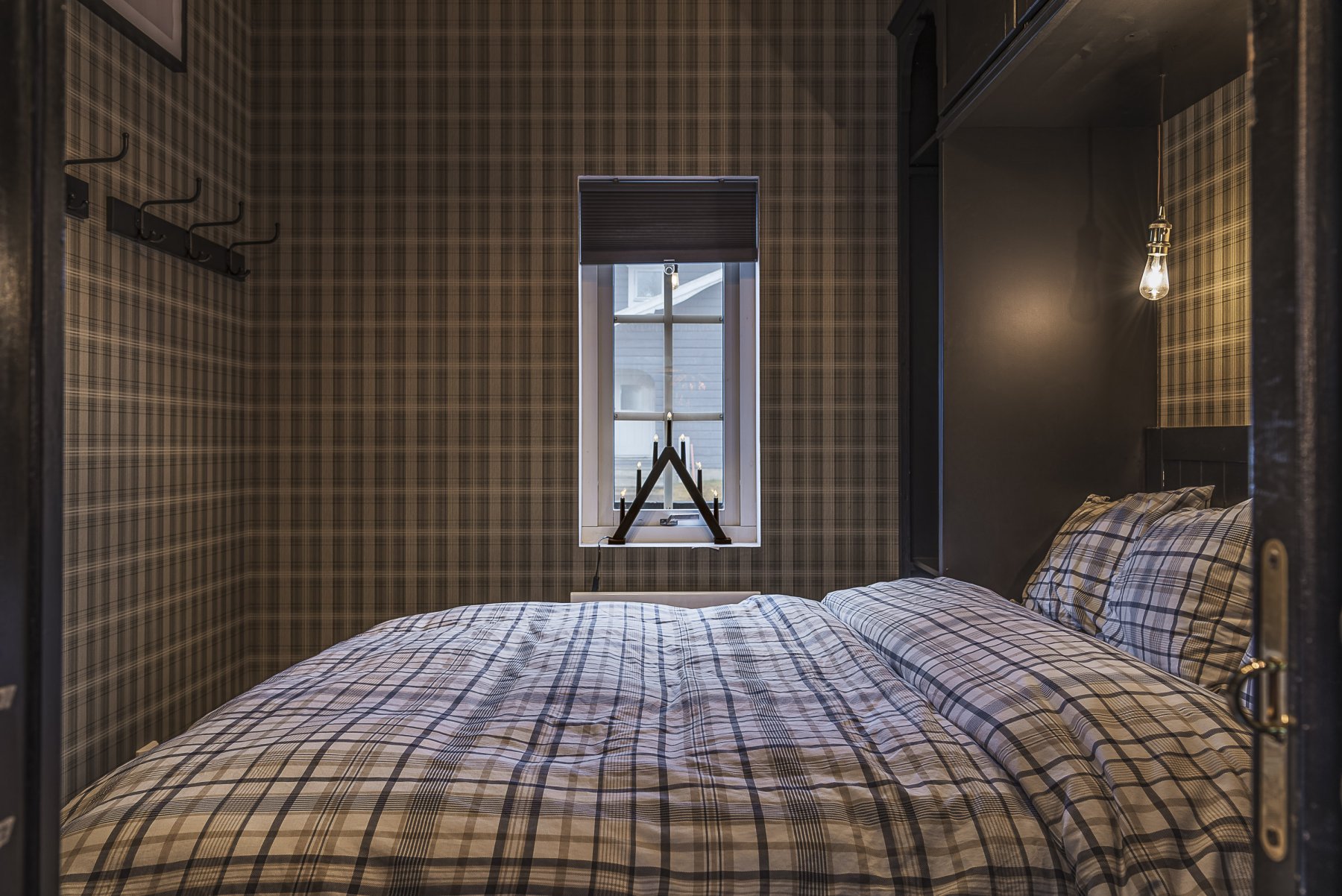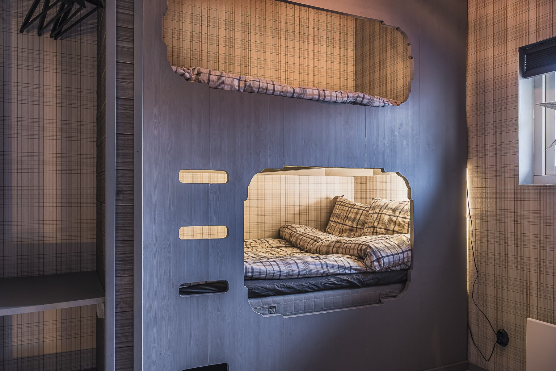 Det mindre sovrummet har en våningssäng med två bäddar. Det finns en garderob och krokar på väggarna för klädupphängning. Under sängen finns ytterligare förvaring i två utdragbara lådor.