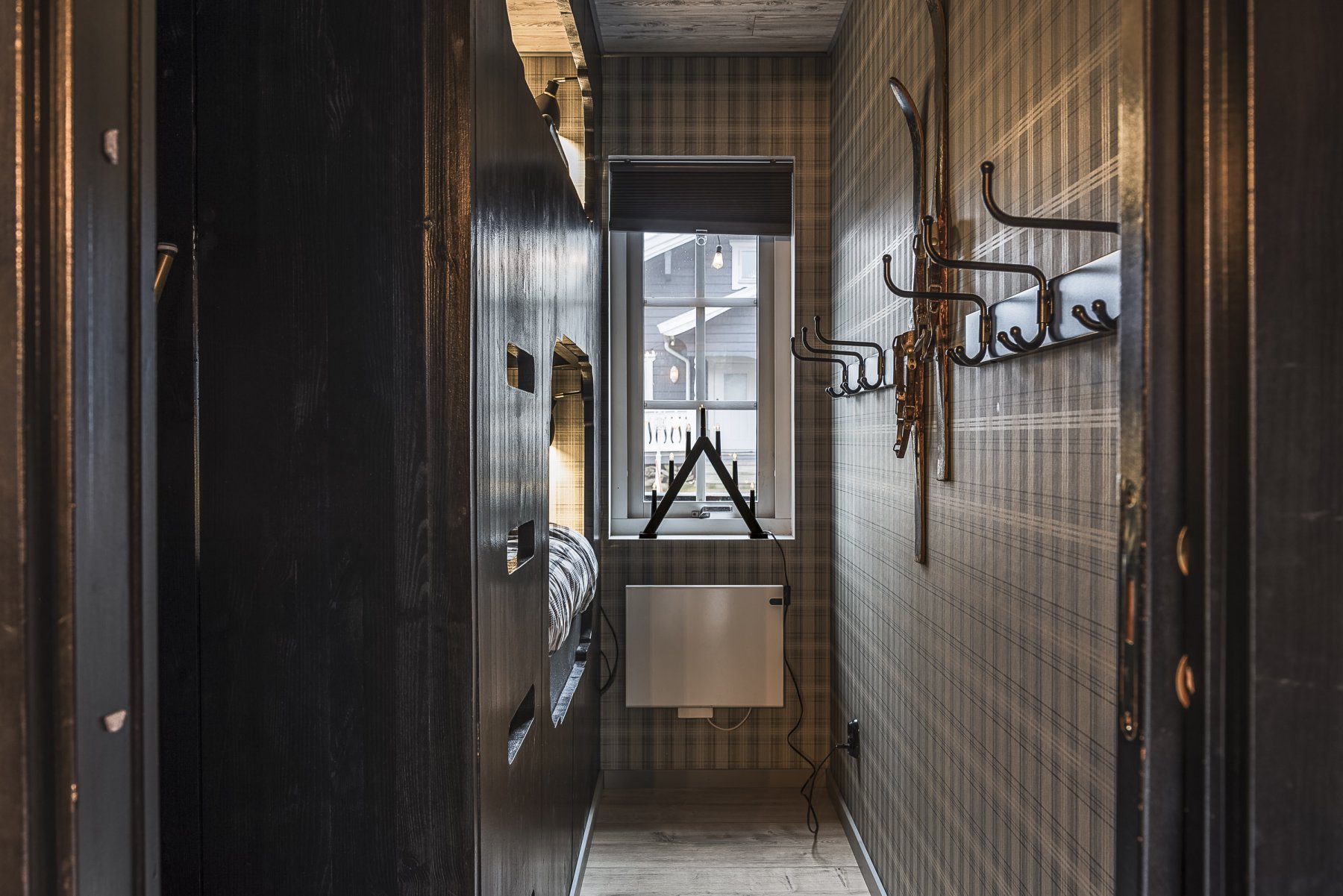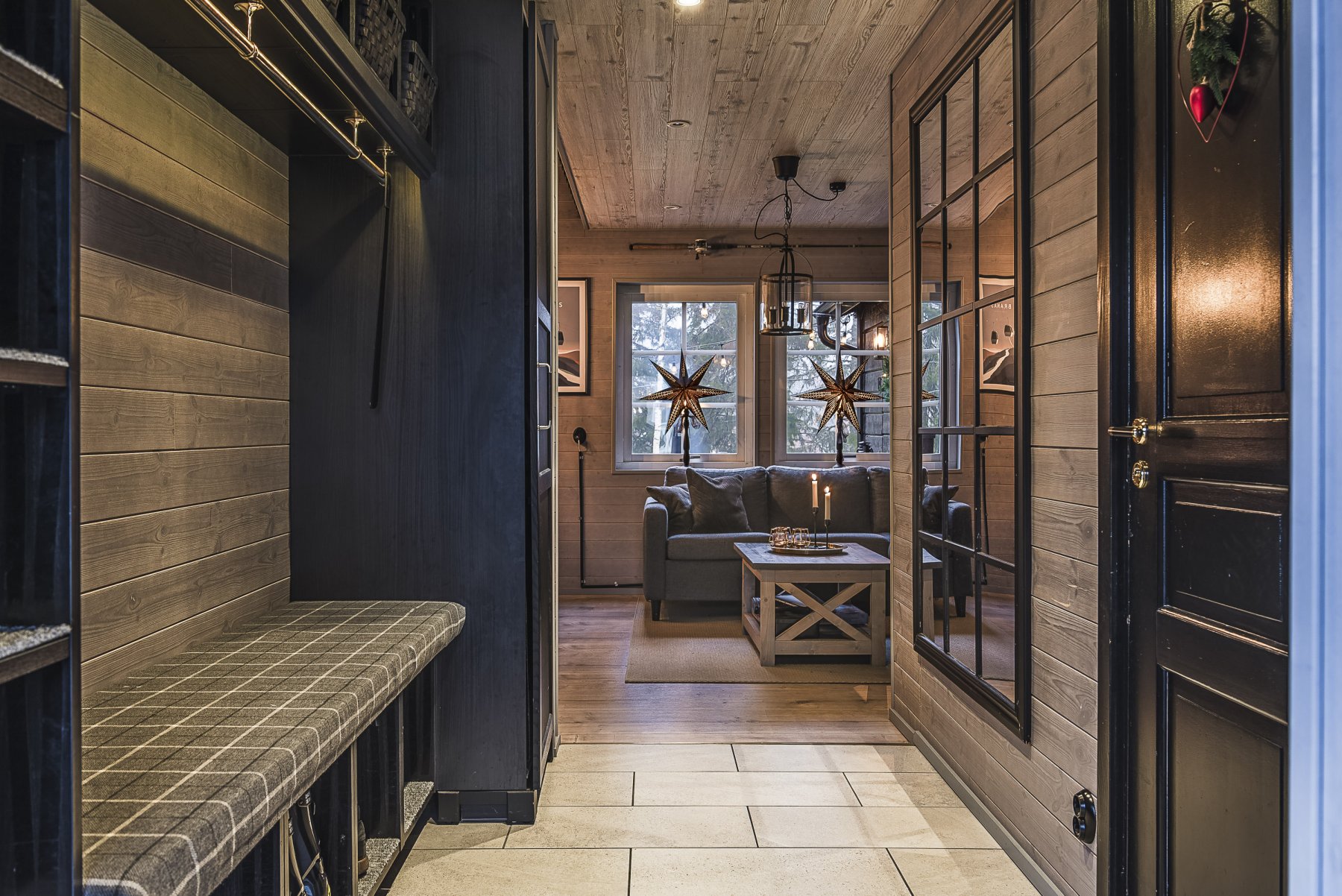 I hallen finns ljusgrå klinker med golvvärme och väggarna har grå träpanel. Det finns en sittbänk kombinera med rymlig sko- och klädförvaring längs med ena väggen. Från hallen når man toalett med dusch med bastu.