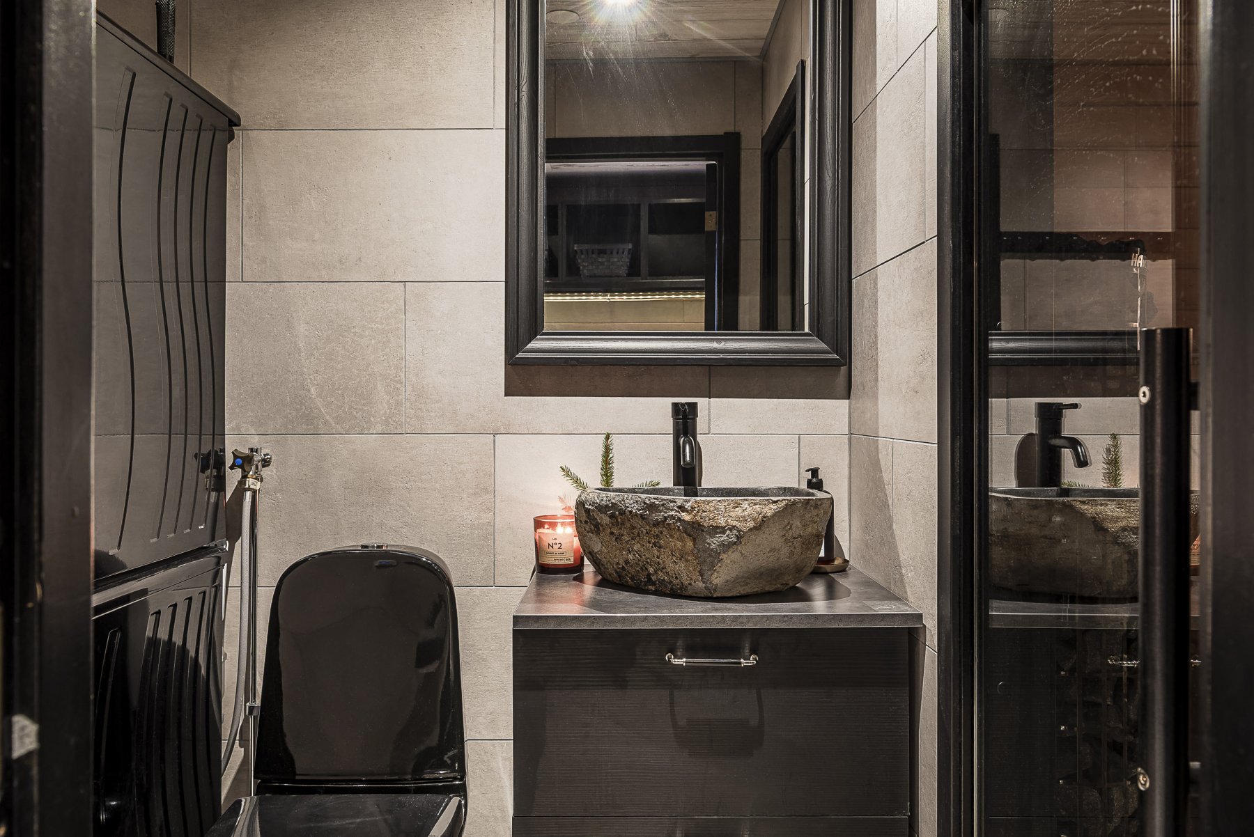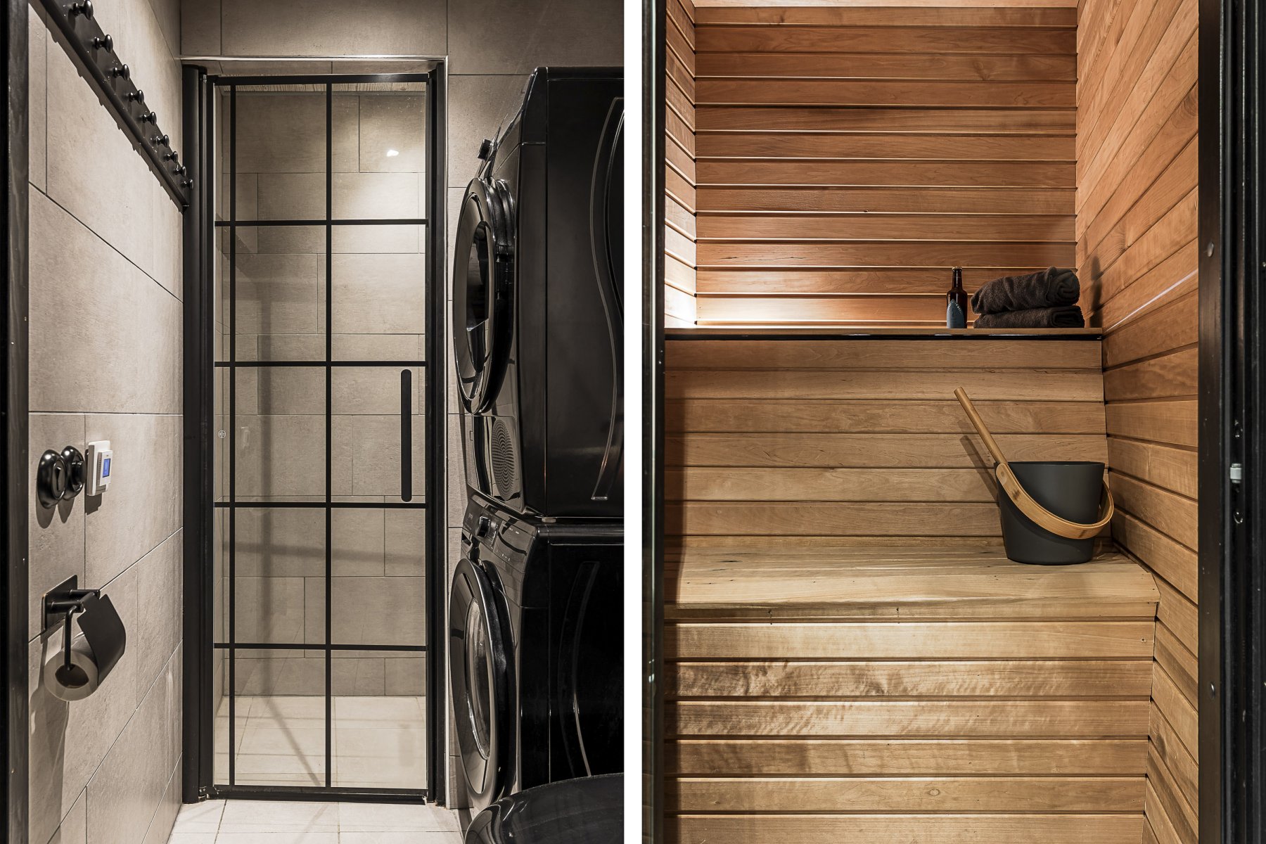 Badrummet på bottenvåningen är renoverat 2021 och har grå klinker med golvvärme samt kaklade gråa väggar. I badrummet finns kommod med förvaring, dusch, bastu, tvättmaskin och wc.