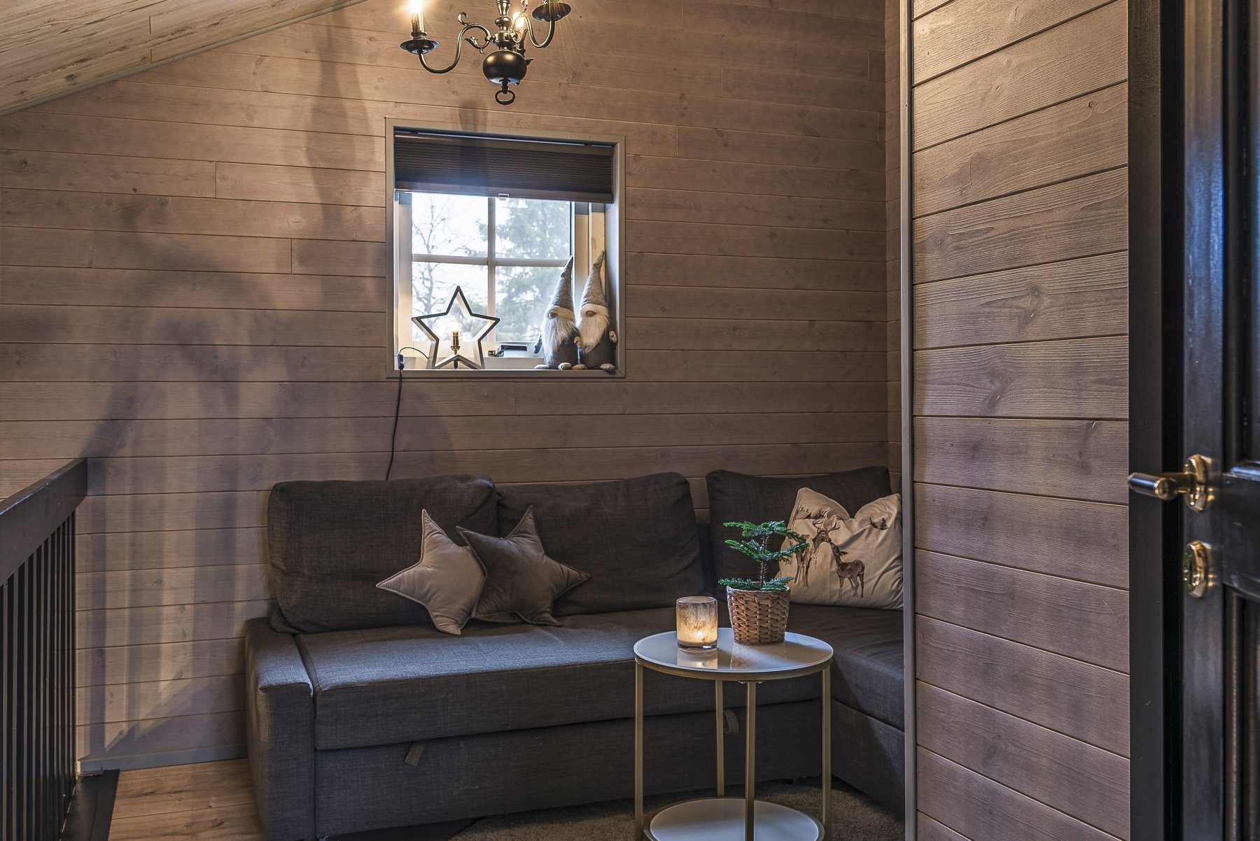 På övre plan finns en mysig tv-hörna med soffa och träpanel på väggarna. Ett perfekt utrymme för barnen att ha egen tv-tid.